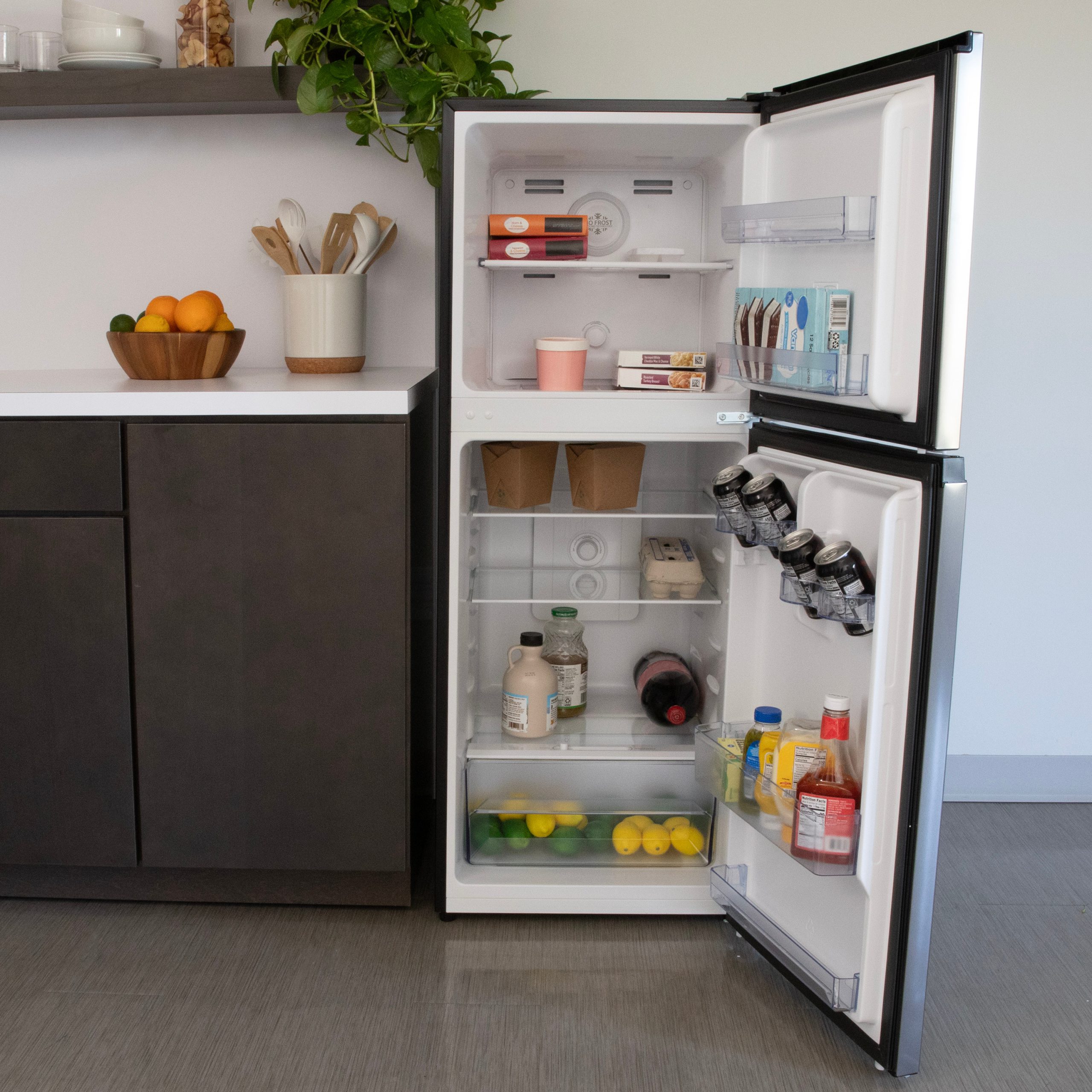 Store your food in the compact, 7.0 cubic foot, white apartment-sized refrigerator with a top mounted freezer from Avanti. The perfect space saving fridge for a studio apartment, game room, tiny home, rental room, condo, vacation home, or anywhere you need a small refrigerator. This apartment sized fridge features full width door bins that hold 2 liter and gallon bottles, adjustable and removable shelving, and a see through crisper. Select the right settings for your items with the adjustable temperature control.