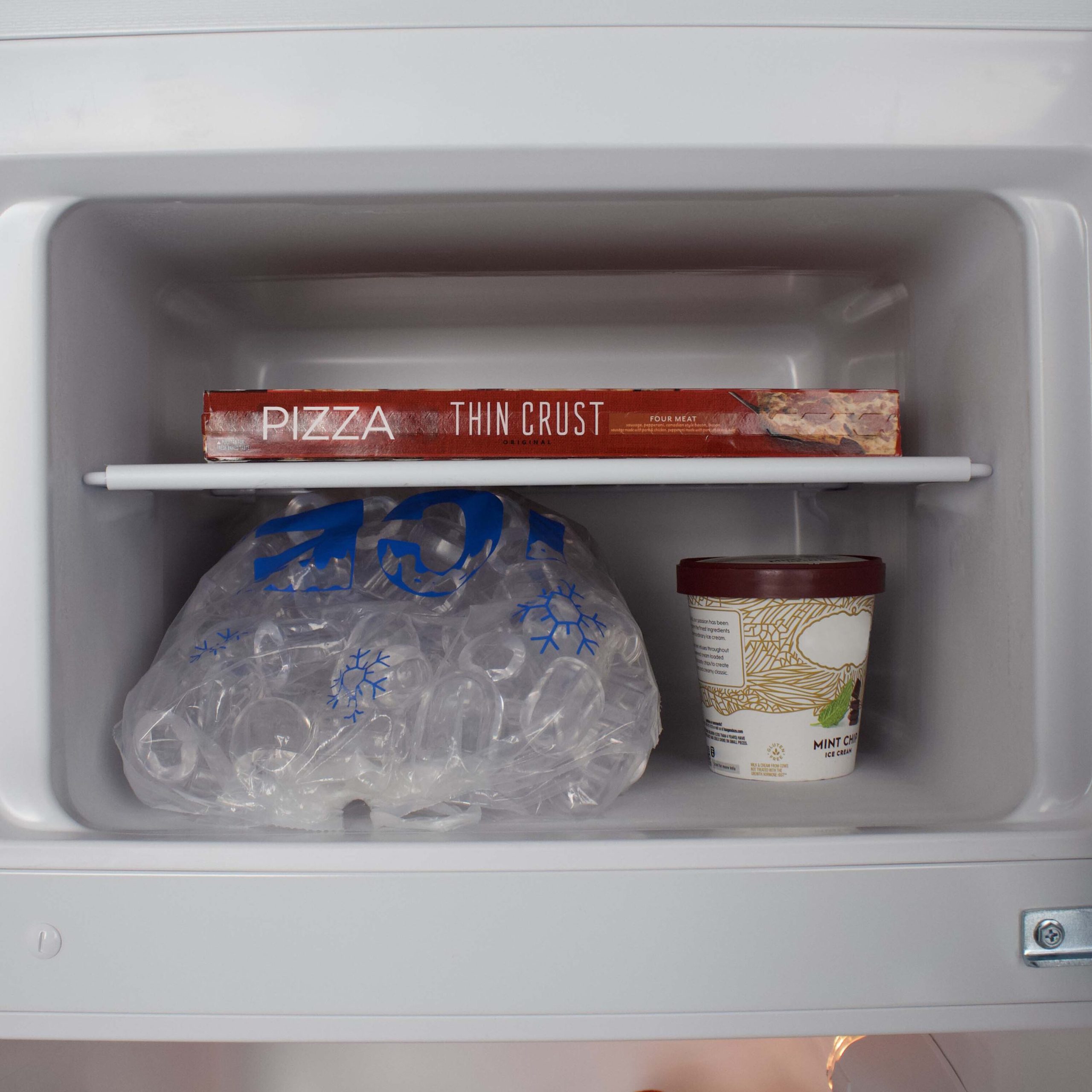 Store your food and beverages in the compact, 7.3 cubic feet, white apartment refrigerator with freezer from Avanti. Ideal for anywhere you need a small refrigerator, it’s the perfect space saving fridge for a studio apartment, game room, tiny home, rental room, condo or vacation home. This apartment sized fridge features full width door bins that hold 2 liter and gallon bottles, adjustable and removable shelves, and a see through crisper for storing your fruits and vegetables. The top mounted freezer includes a wire shelf to keep your frozen foods organized. Select the right settings for your items with the adjustable temperature control. Covered by the Avanti One Year Limited Warranty.