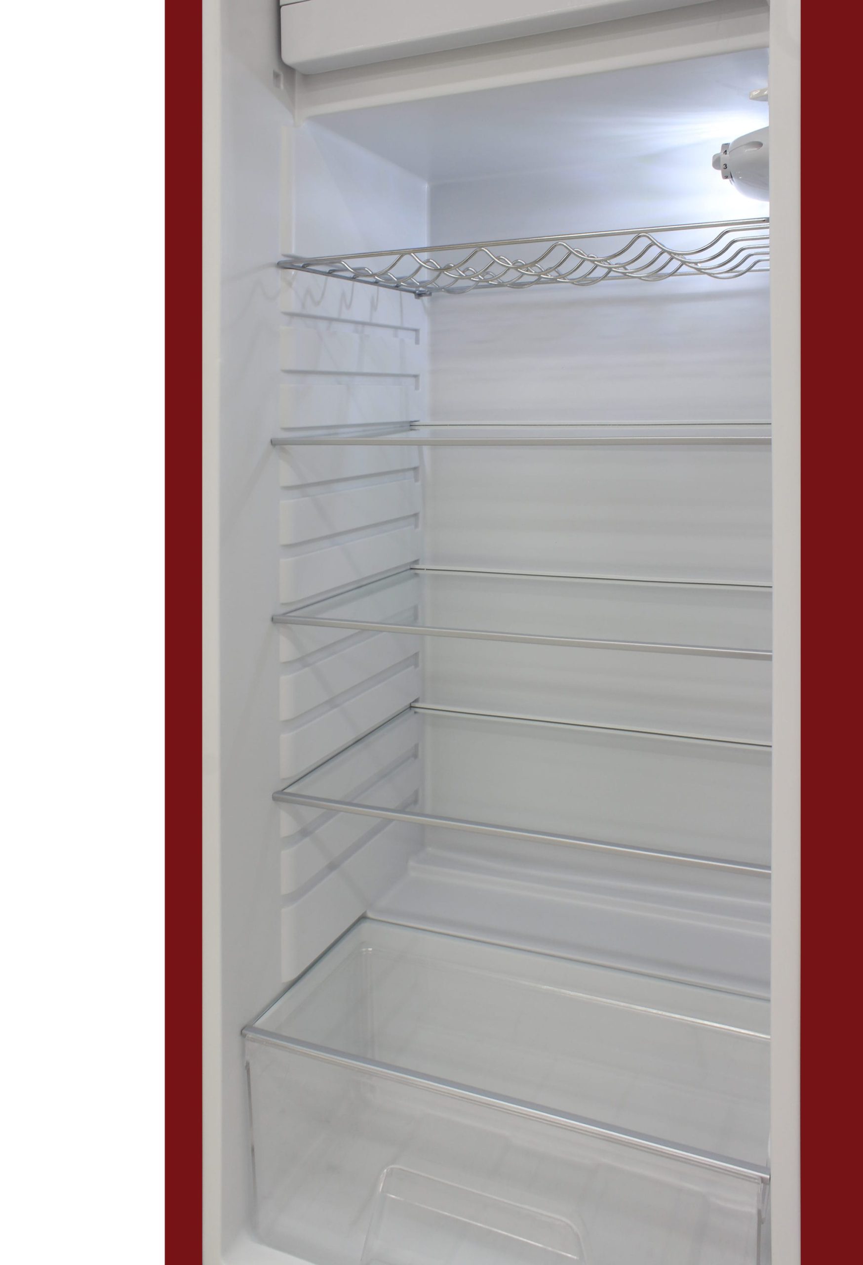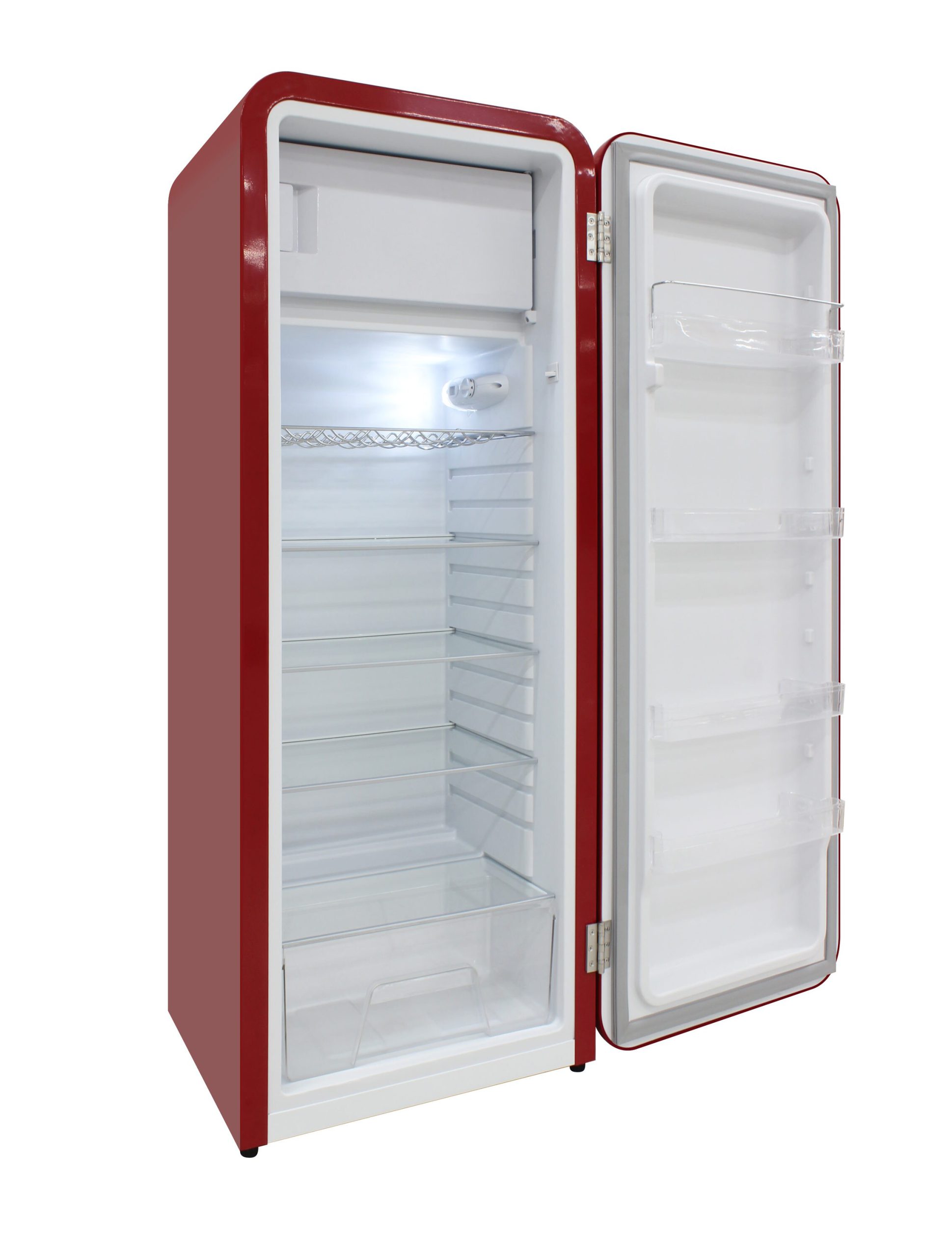 Keep all of your goods at the perfect serving temperature with the Brama Retro Refrigerator. This unit features a top freezer, interior light, open storage with 4 pull-out shelves including one metal wire racking, bottom bulk storage, and 4 rows of small storage behind the door. The red, rounded exterior with solid steel door gives a retro and modern look and makes a perfect addition to to any space.