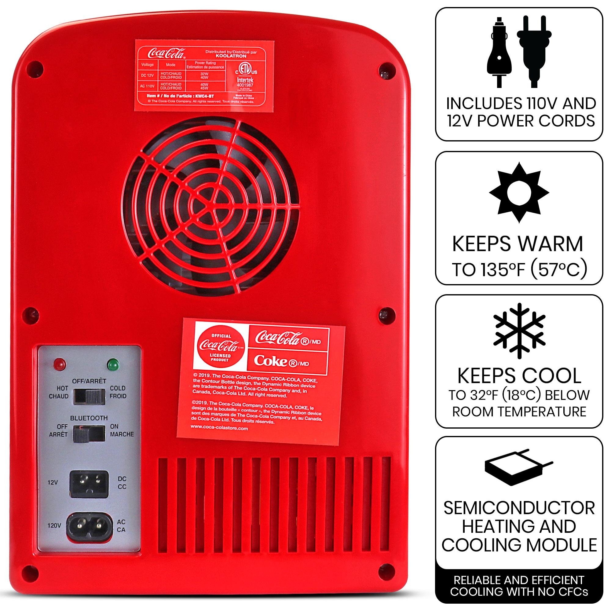This unique combination mini fridge and Bluetooth speaker with vintage Coca-Cola artwork merges modern technology with retro design for the best of both worlds. Efficient thermoelectric technology, along with AC and DC adapters, allows you to chill your favorite soda or warm your lunch while the built-in speaker connects wirelessly to your device to play your favorite music at home or on the go. With its compact size and versatile functionality, this mini fridge is the perfect addition to any space, whether it’s your kitchen, office, dorm, or RV. Experience the convenience of chilling your beverages and enjoying your favorite tunes with this innovative mini fridge and Bluetooth speaker combo.