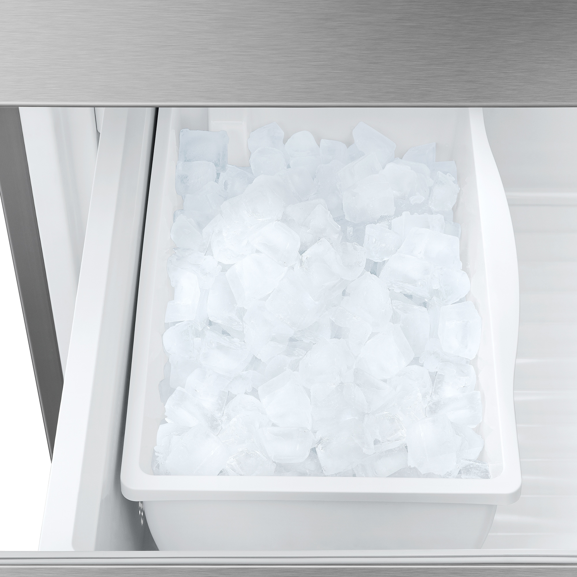 The refrigerator comes with an automated ice maker in the freezer drawer