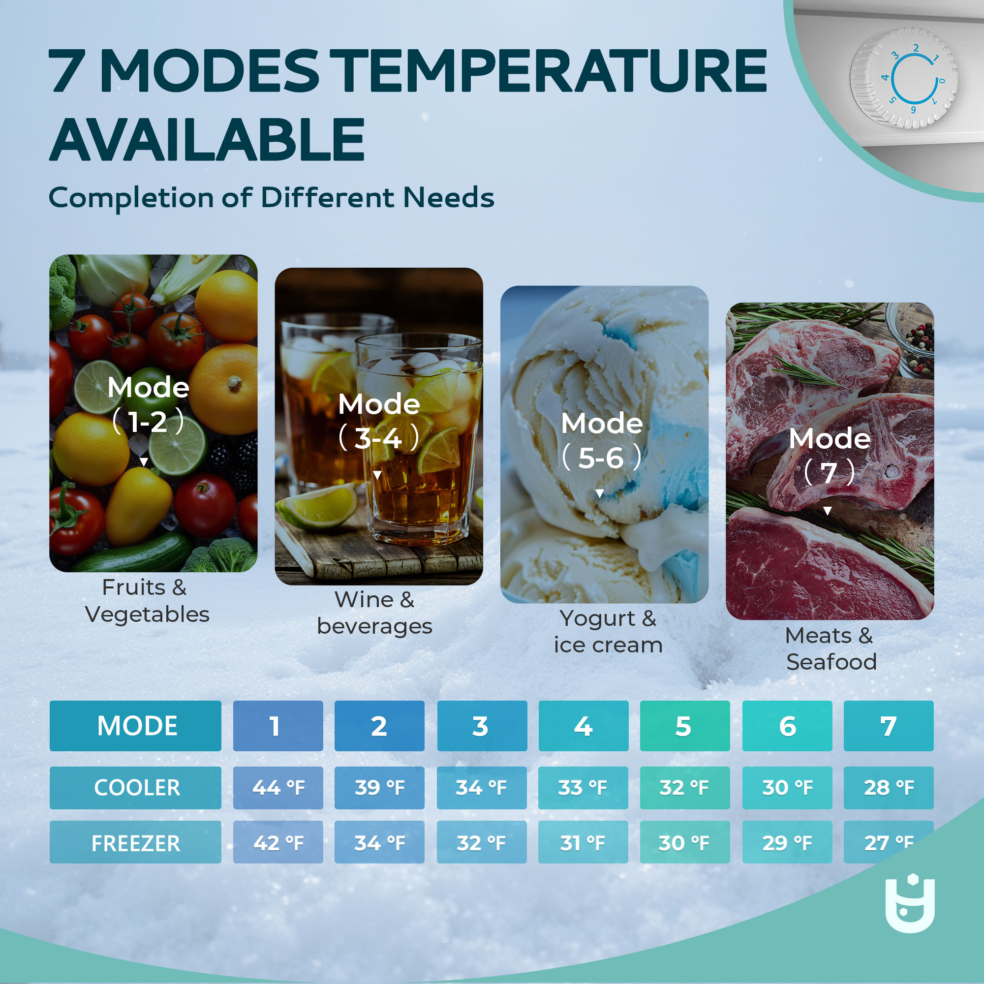 4.1 cu ft refrigeration section (21°F to 42°F) and 0.3 cu ft mini-refrigeration section (15°F to 28°F)