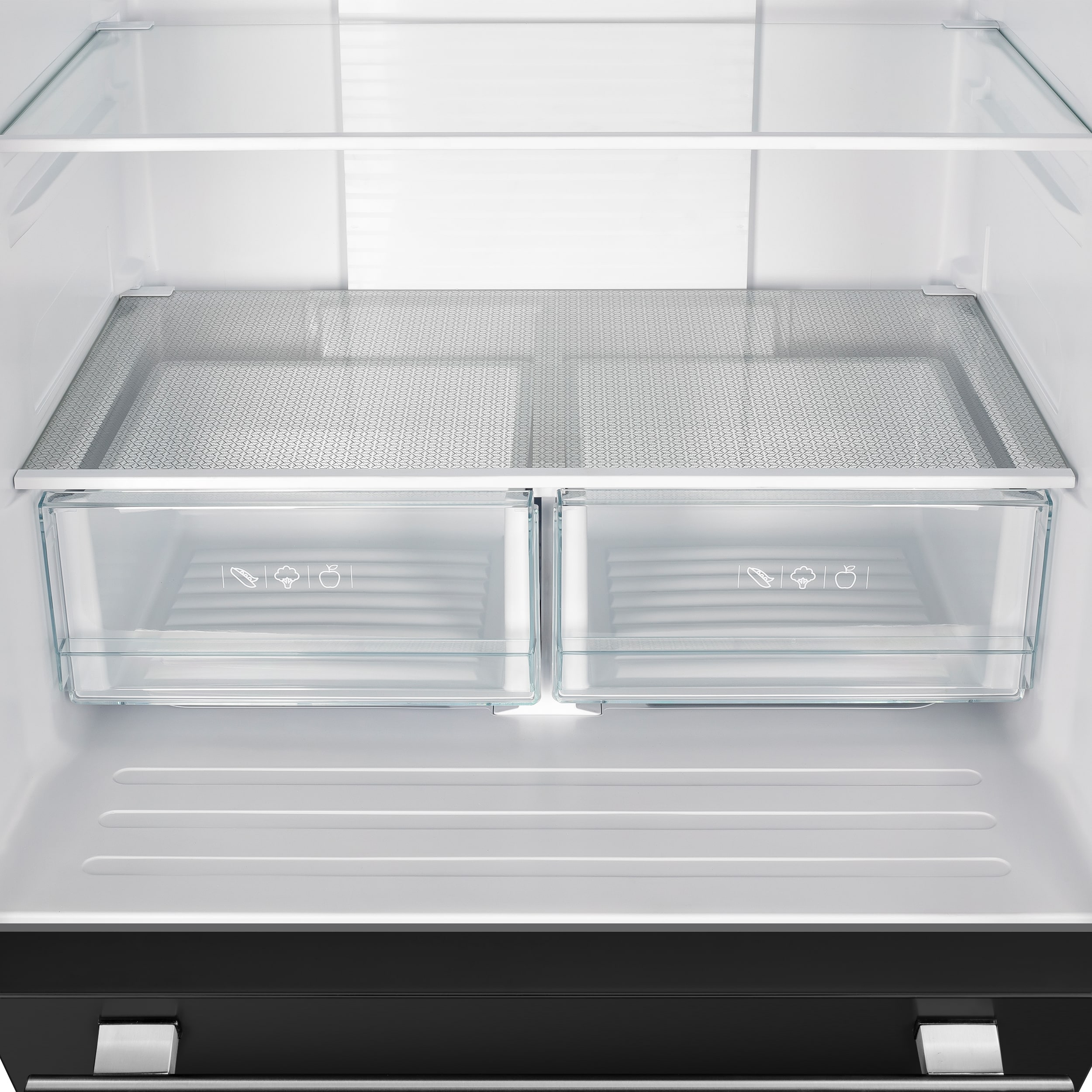 The fresh food compartment is equipped with 3 glass shelves, 6 door bins, and 2 drawers.