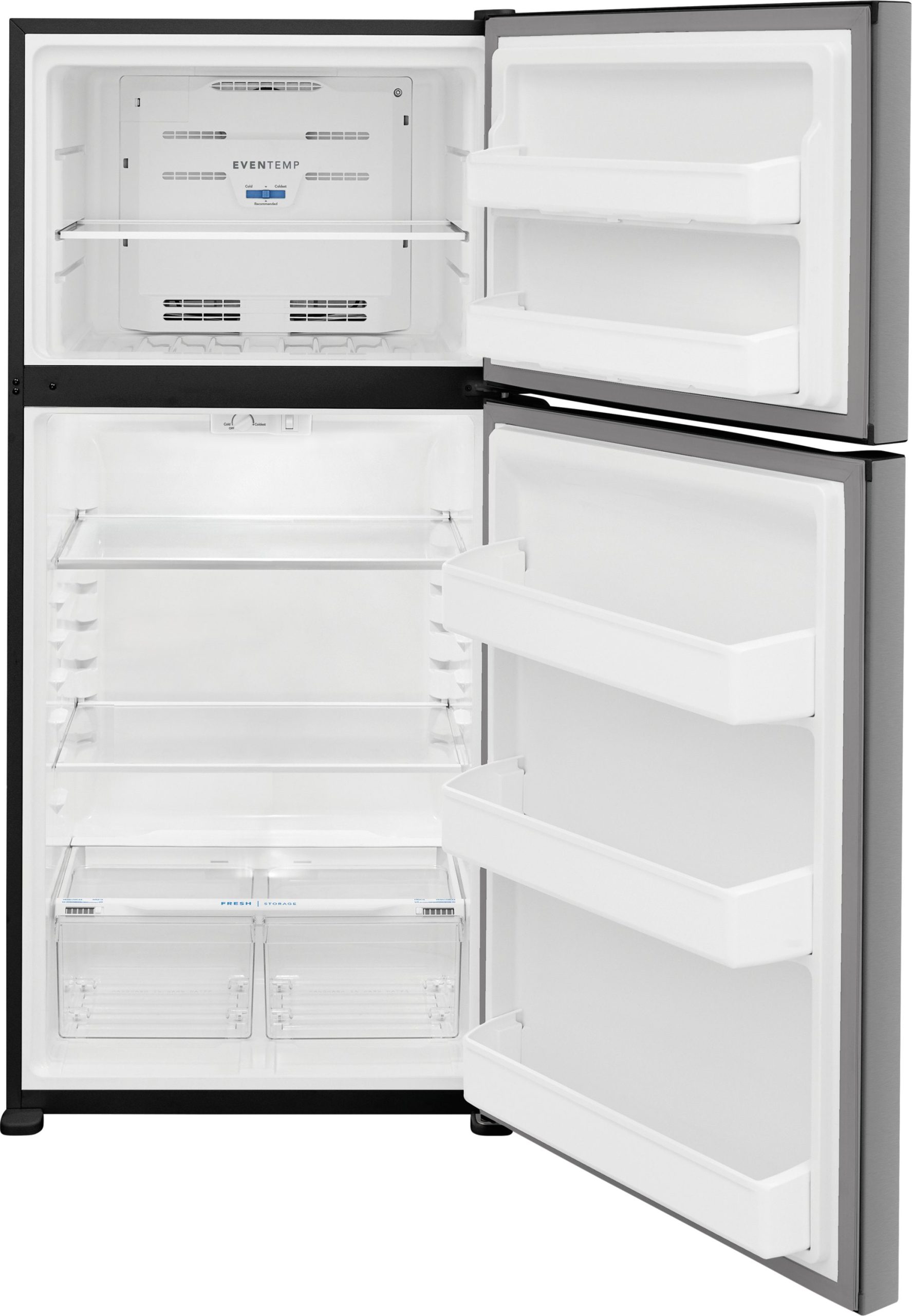 This Frigidaire 18 cu. ft. top freezer refrigerator includes spacious interior storage options designed for busy families, including generous door bins and adjustable full-width glass shelving. Our humidity-controlled crispers keep produce fresh for longer, allowing you to waste less and save money.