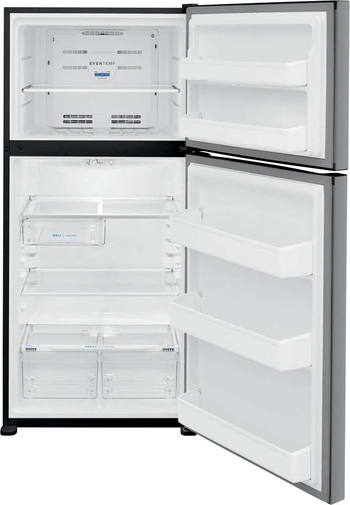 This 18.3 cu ft refrigerator prevents warm spots and unwanted freezing with the EvenTemp™ cooling system’s optimized airflow that ensures a consistent temperature throughout your refrigerator. Find a place for everything with our flexible interior storage options designed for busy families, including full-width glass shelving in the freezer and refrigerator, a sliding half-width deli drawer, and spacious door bins. Keep produce fresher longer, so you waste less and save money with our humidity-controlled crisper drawers with roller support.