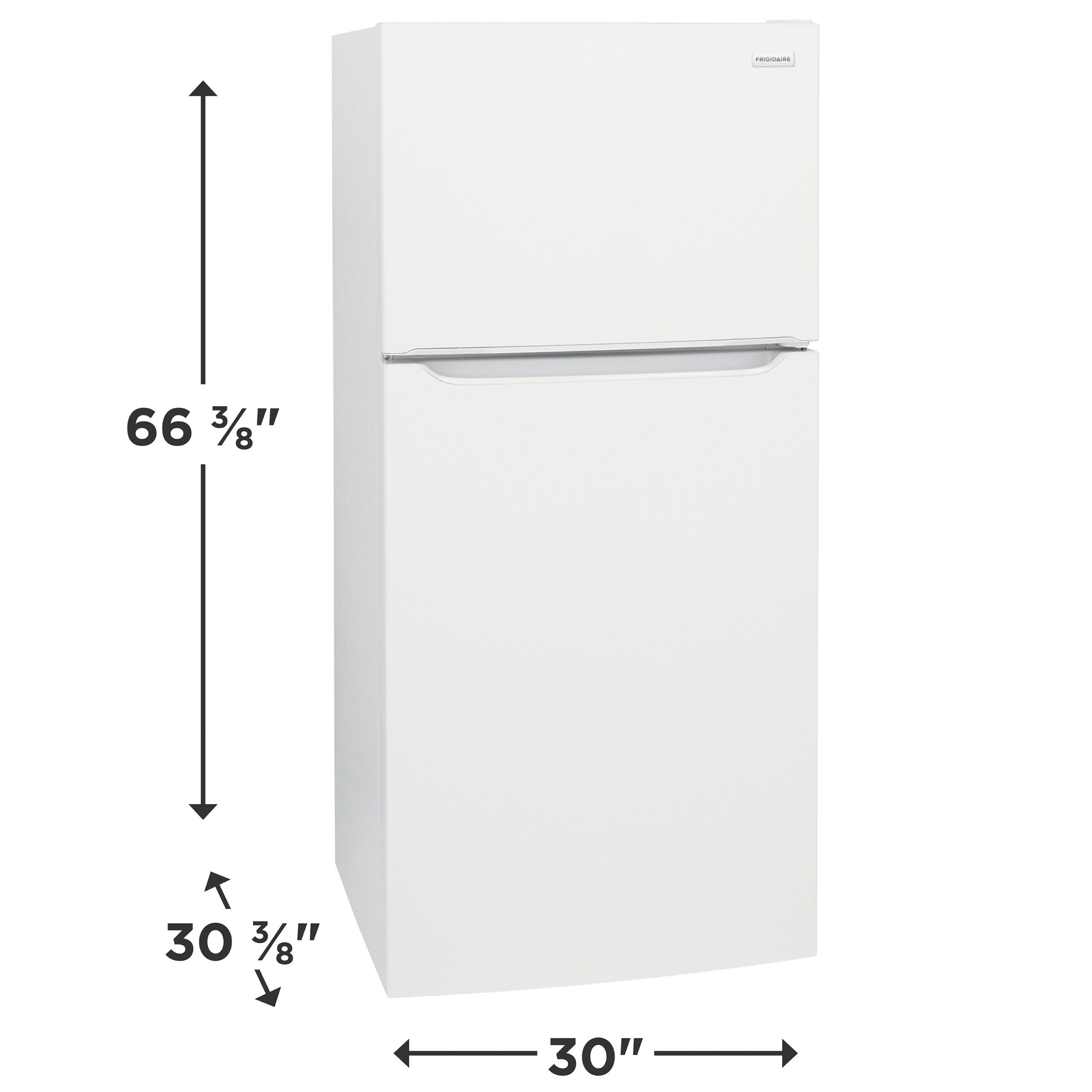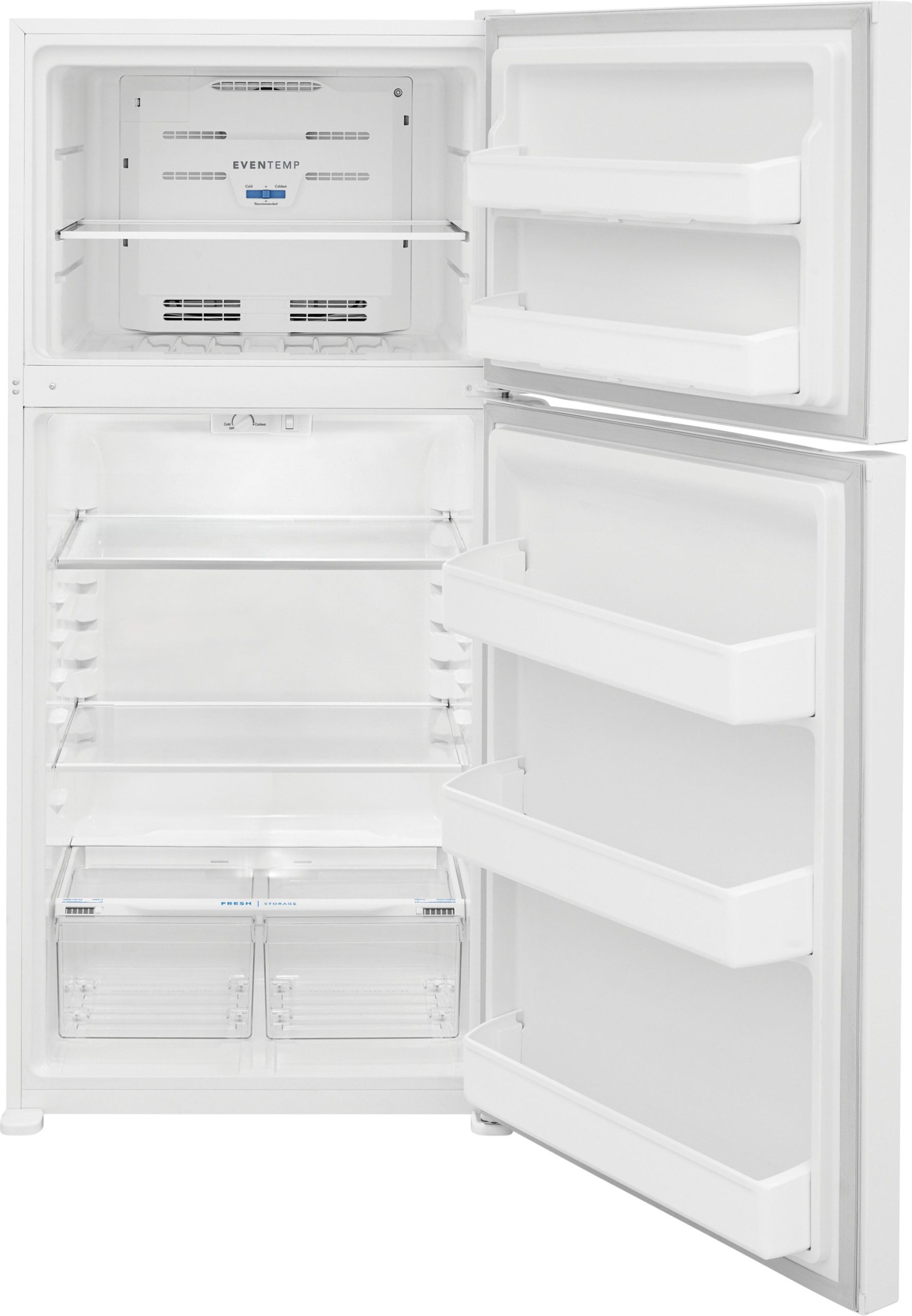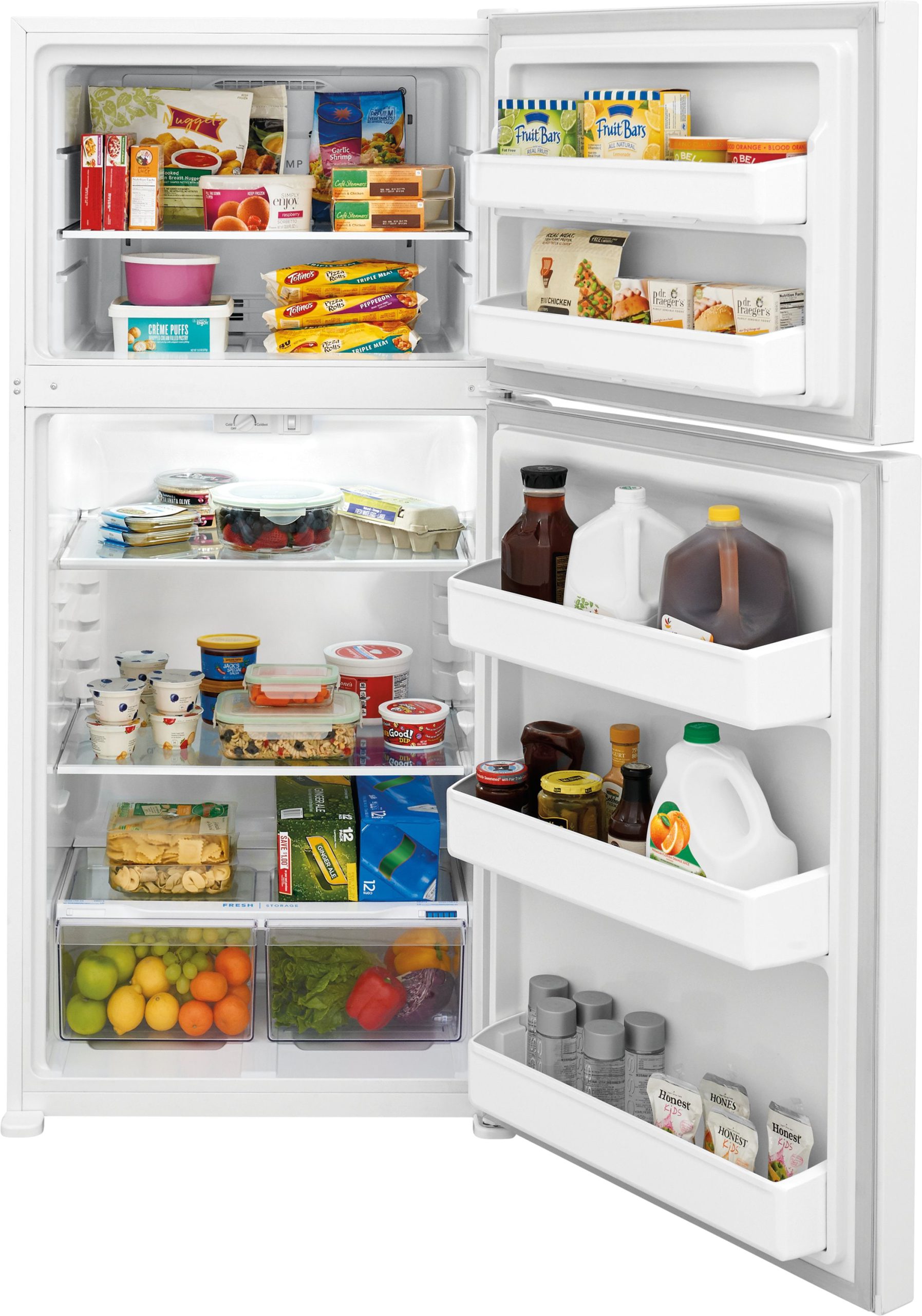 This Frigidaire 18 cu. ft. top freezer refrigerator includes spacious interior storage options designed for busy families, including generous door bins and adjustable full-width glass shelving. Our humidity-controlled crispers keep produce fresh for longer, allowing you to waste less and save money.