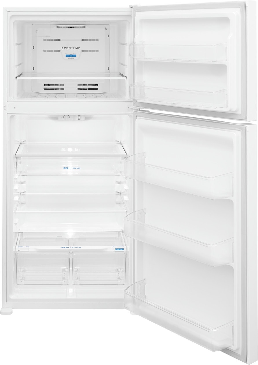 The Frigidaire 20 cubic foot top freezer refrigerator fits in the same sized cutout as a traditional 18 cu. Ft model (30-in width x 66-in height cutout). This refrigerator features the EvenTemp™ Cooling System, precise temperature control which keeps food at one ideal temperature. Spacious interior storage options include a full-width deli drawer, generous door bins, and a full-width glass freezer shelf.
