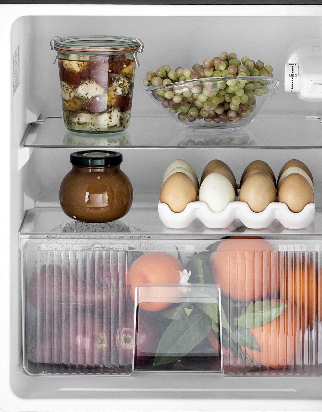 Glass shelves – creates convenient food storage with easy-to-clean shelves