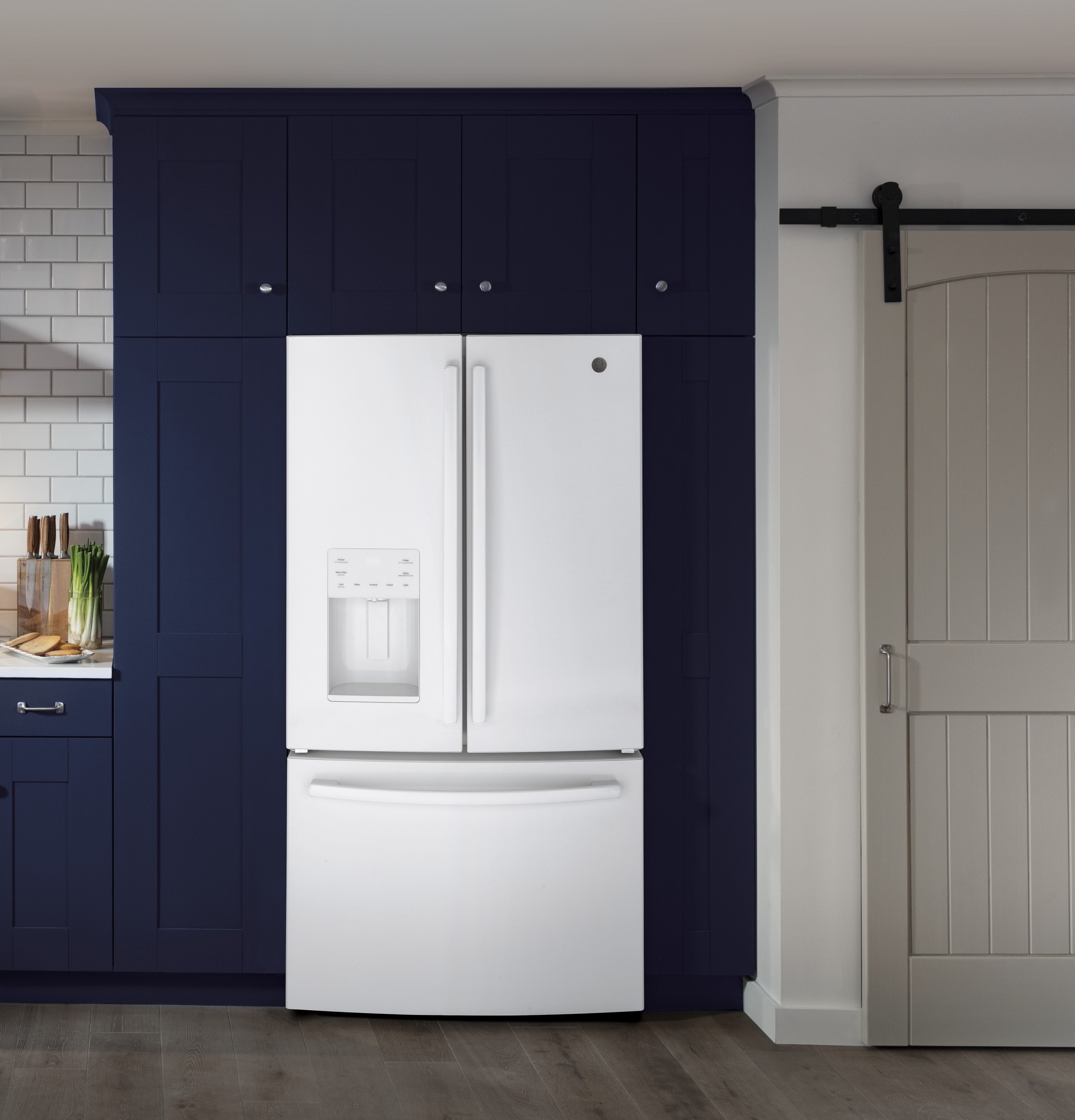 Color-matched external Ice and water dispenser – fills tall bottles, stores and makes ice on the door, saving space