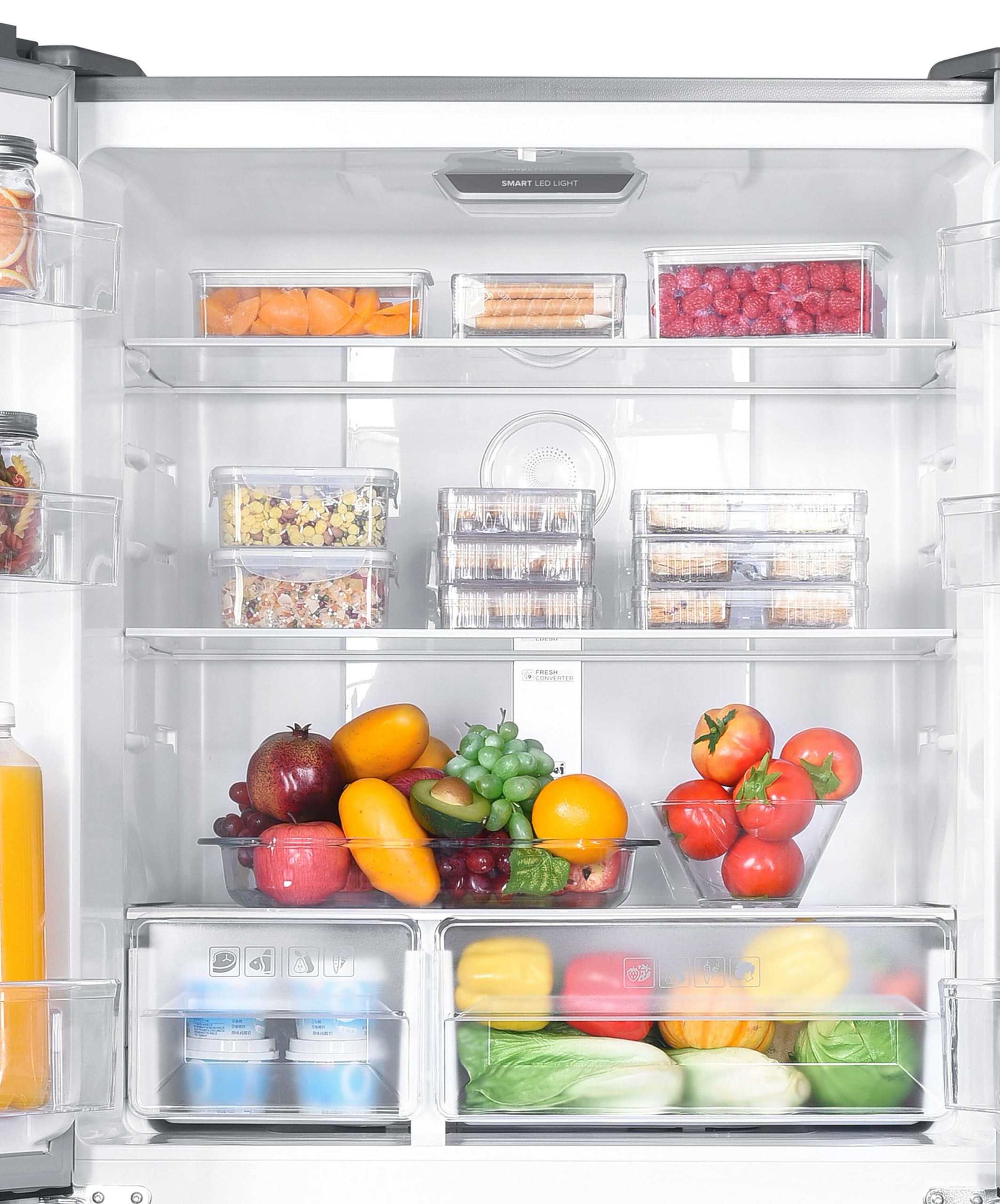 4 Door French Style Refrigerator with multiple adjustable glass shelves.
