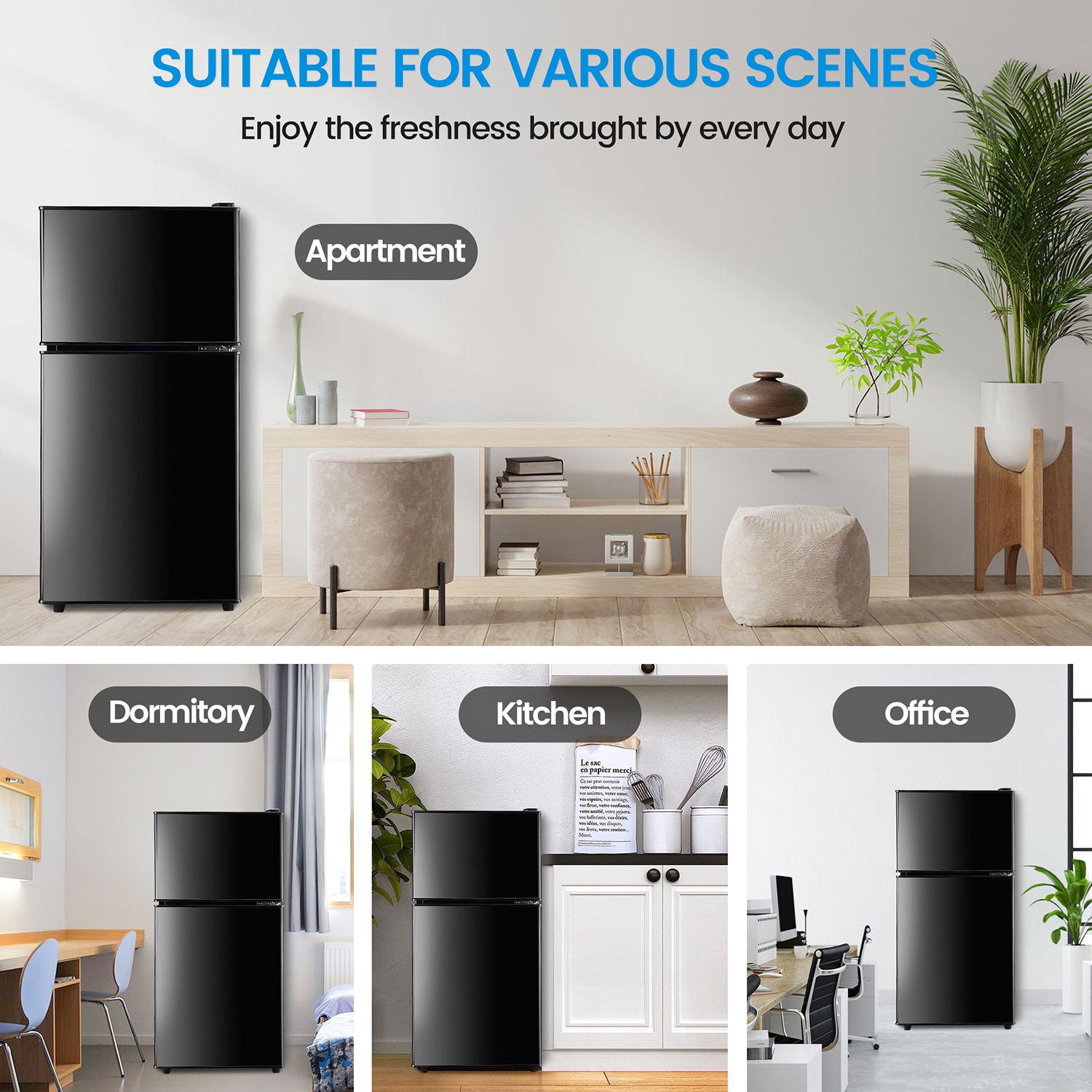 This 3.5 cu.ft mini fridge is ideal for use in bedrooms, offices, apartments and bars. Double circulation zone cooling and double circulation zone cooling can isolate the outside heat, effectively maintain the temperature in the box, and improve the effect of food preservation. When the ambient temperature is below 0 degree, turn on the switch to make the refrigerator work passively, so that the temperature of the freezer is kept in the state of low temperature freezing. Double door design can keep fresh ingredients, lock food moisture, fruits and vegetables, drinks, snacks, etc. Fast refrigeration to lock in the nutrients of the ingredients; Storage: Fish, seafood, meat, ice cream, etc.