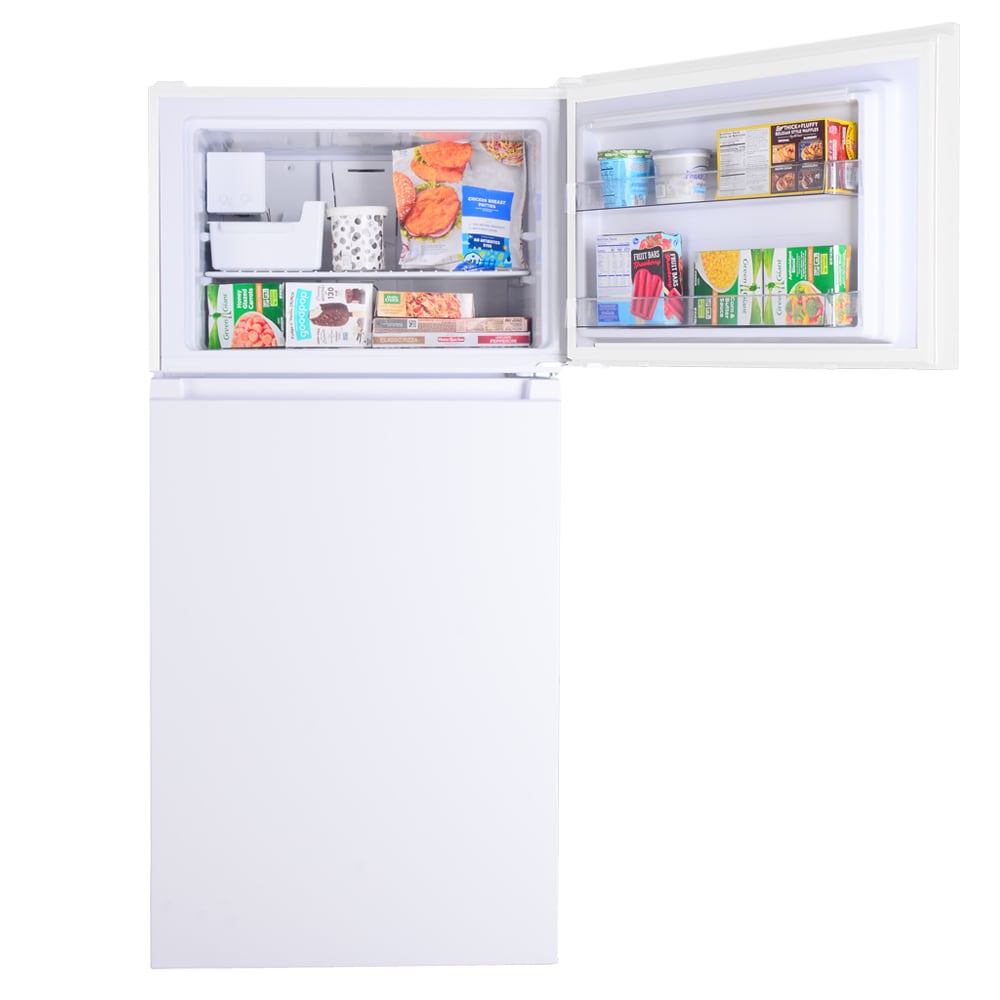This Kenmore large white refrigerator and freezer has plenty of space to store your food and drinks, in style. This fridge has 18.1 cu. ft. of storage space, all in a 30-in wide footprint, saving space in your kitchen. Don’t worry, though, as this fridge with freezer is still the traditional standard-depth design! This refrigerator for your apartment or home comes with a factory installed icemaker that produces up to 4 lbs. of crescent shaped ice per day. With a sleek, stylish construction and three different finish options, this white appliance is sure to fit in to any decor scheme. It features adjustable, full-width glass shelves, so you can customize your fridge to fit taller bottles and make the most of your space. The clear humidity controlled crisper lets you choose the ideal humidity level to keep your fruits and vegetables fresh, while the clear dairy compartment can store all your butters and spreads at their ideal temperature. Both the refrigerator and the top freezer have clear door bins, 3 in the fridge that can store a gallon of milk and 2 in the freezer to help you keep things organized and easily accessible. And don’t worry about the energy bill, because this LED lighting refrigerator is ENERGY STAR® Certified, keeping energy use reasonable and costs low. The whole refrigerator freezer unit finishes with an elegant pocket style handle, recessed for a sleek flush-front design. Truly, it’s the perfect multifunctional fridge and freezer set for any home!