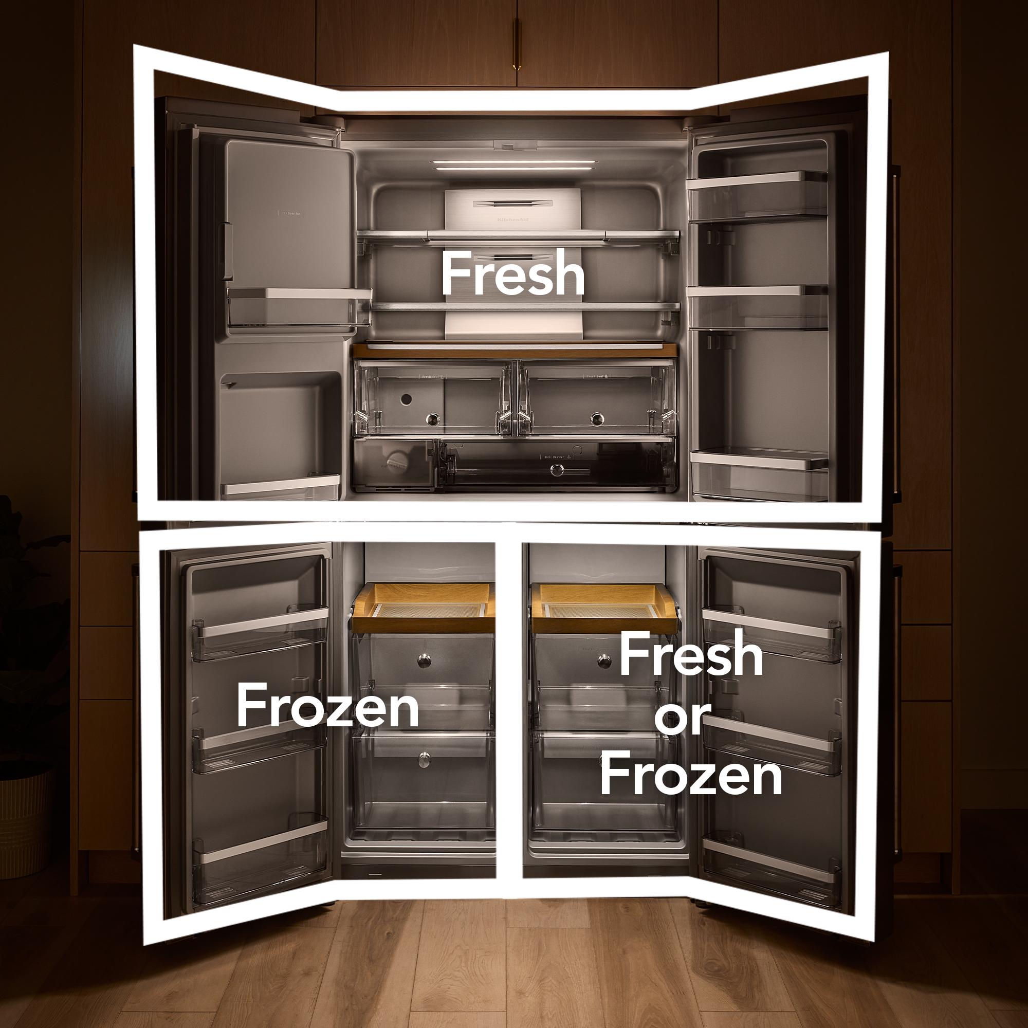Designed with entertaining in mind, the KitchenAid® 4-Door Counter-Depth refrigerator with Exterior Ice and Water is the life of the party with its show-stopping interior, large capacity ice production, removable beverage caddy and more. Experience our most customizable multi-zone cooling system, including a Flexible Temperature Zone, that goes from refrigerator to freezer to wine cellar at the touch of a button—allowing you to adjust capacity as needed.