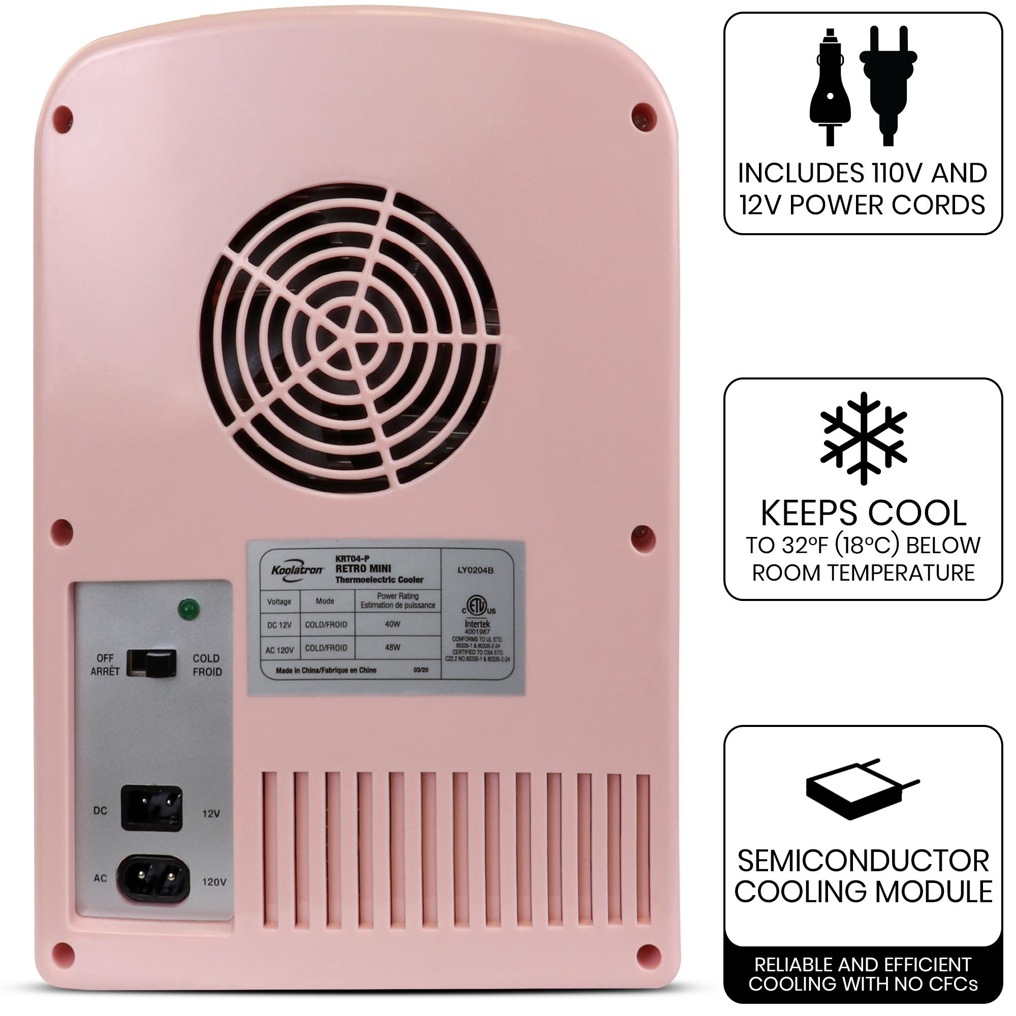 This pretty pink portable cooler with retro refrigerator design and chrome accents holds up to six standard soda cans and adds vintage charm to any home or dorm. Efficient thermoelectric cooling technology and AC and DC adapters mean you can keep your favorite drinks cold or safely store items such as yogurt, cheese, milk, cosmetics, and infant formula whether you’re at home or on the go.