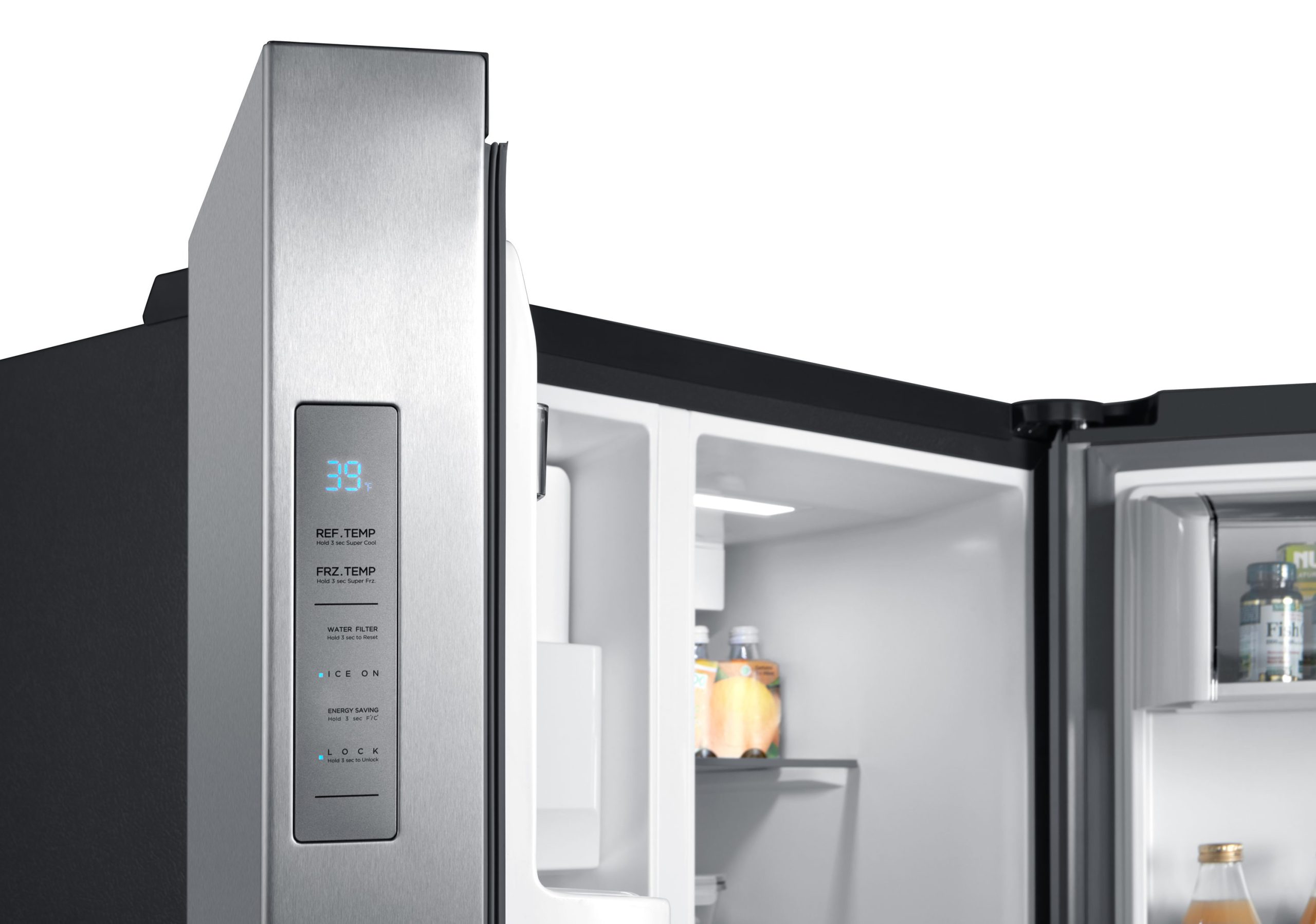 Elegant dispenser design – on-door cubed/crushed ice and water access with backlit selector keys that remain hidden until activated Gallon plus door bins – give you room for larger items like milk and juice bottles