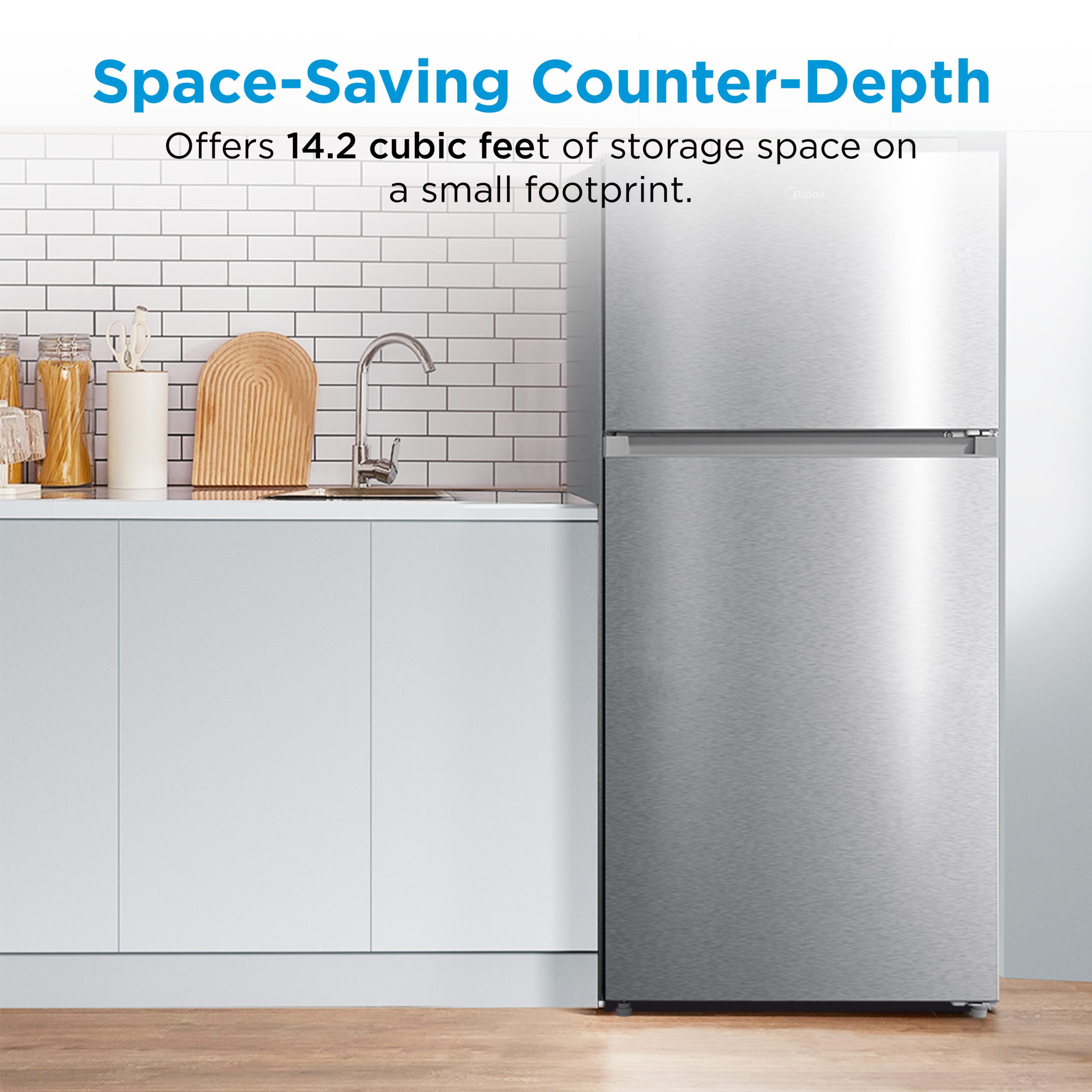 Upgrade your kitchen with the Midea 14.2-cu ft Counter-Depth Top-Freezer Refrigerator, which offers both a wide range of convenient features and energy-efficient performance. The internal LED lighting ensures that you can always find what you’re looking for, while the electronic control panel makes temperature adjustments a breeze. Humidity-controlled crisper drawers keep your produce fresh, and the reversible door allows for flexible installation. The top-freezer design puts frozen foods at eye level for easy access. Bring home this refrigerator today to optimize your food storage capabilities and keep your kitchen running smoothly.
