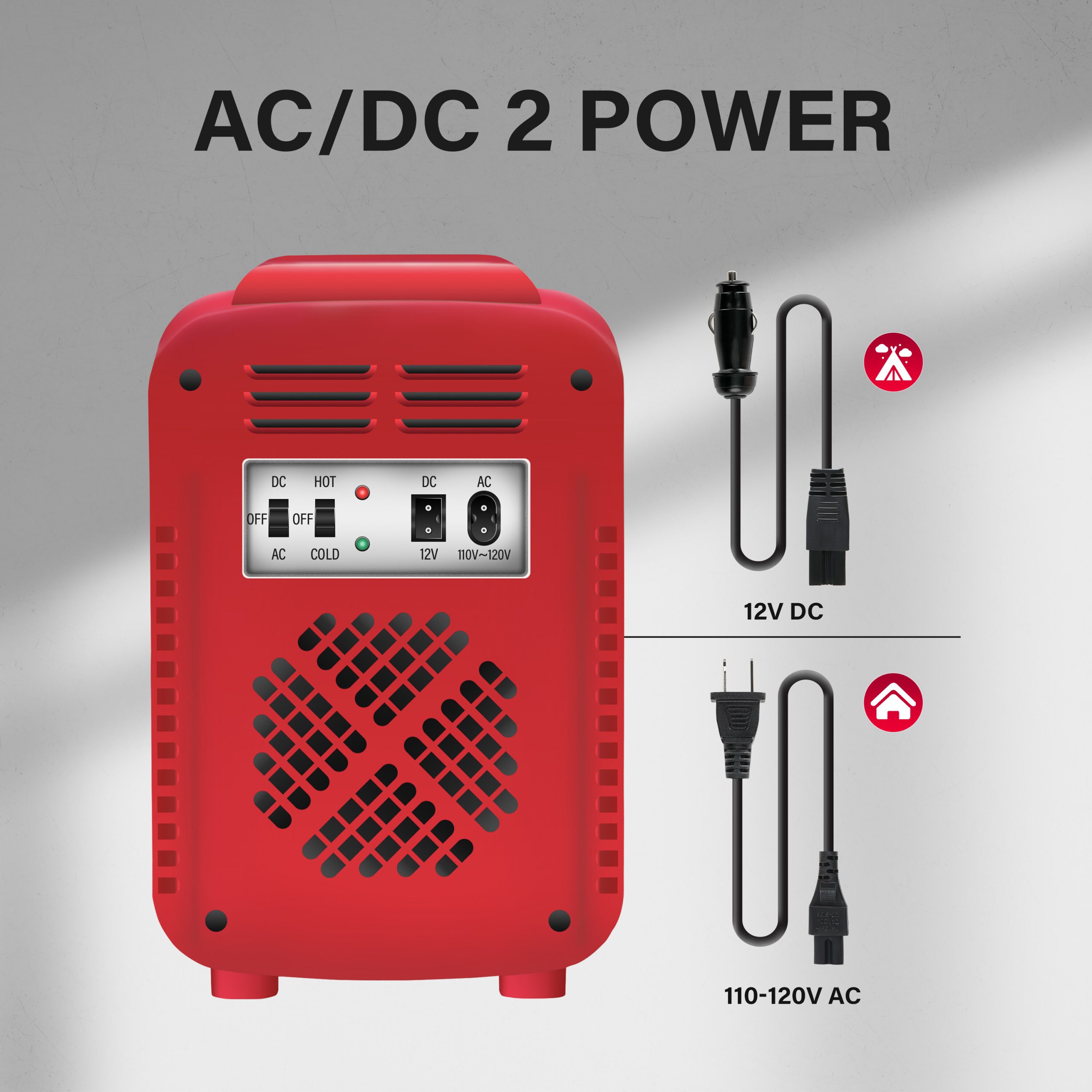 This red portable cooler with retro refrigerator design and chrome accents holds up to six 12 oz cans and adds vintage charm to any home or dorm. Efficient thermoelectric cooling technology and AC and DC adapters mean you can keep your favorite drinks cold or safely store items such as yogurt, cheese, milk, cosmetics, and infant formula whether you’re at home or on the go.