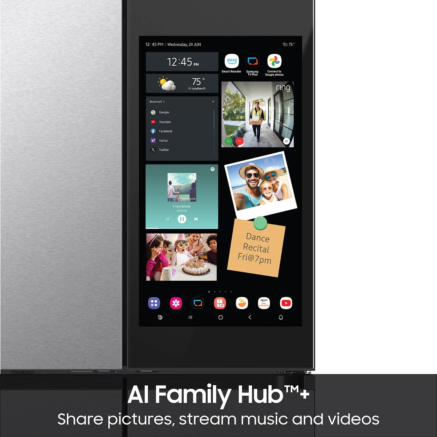 AI Family Hub™+, it’s more than a fridge: AI Family Hub™+ features a 32” screen(Refrigerator smart video screen); for an enhanced user experience; It utilizes AI for image recognition and recipe recommendations; Family Hub™+ keeps you connected to your family and home(Wi Fi connection and Samsung account required); Share pictures, stream music and videos, access recipes, control your smart devices and Alexa all from the fridge