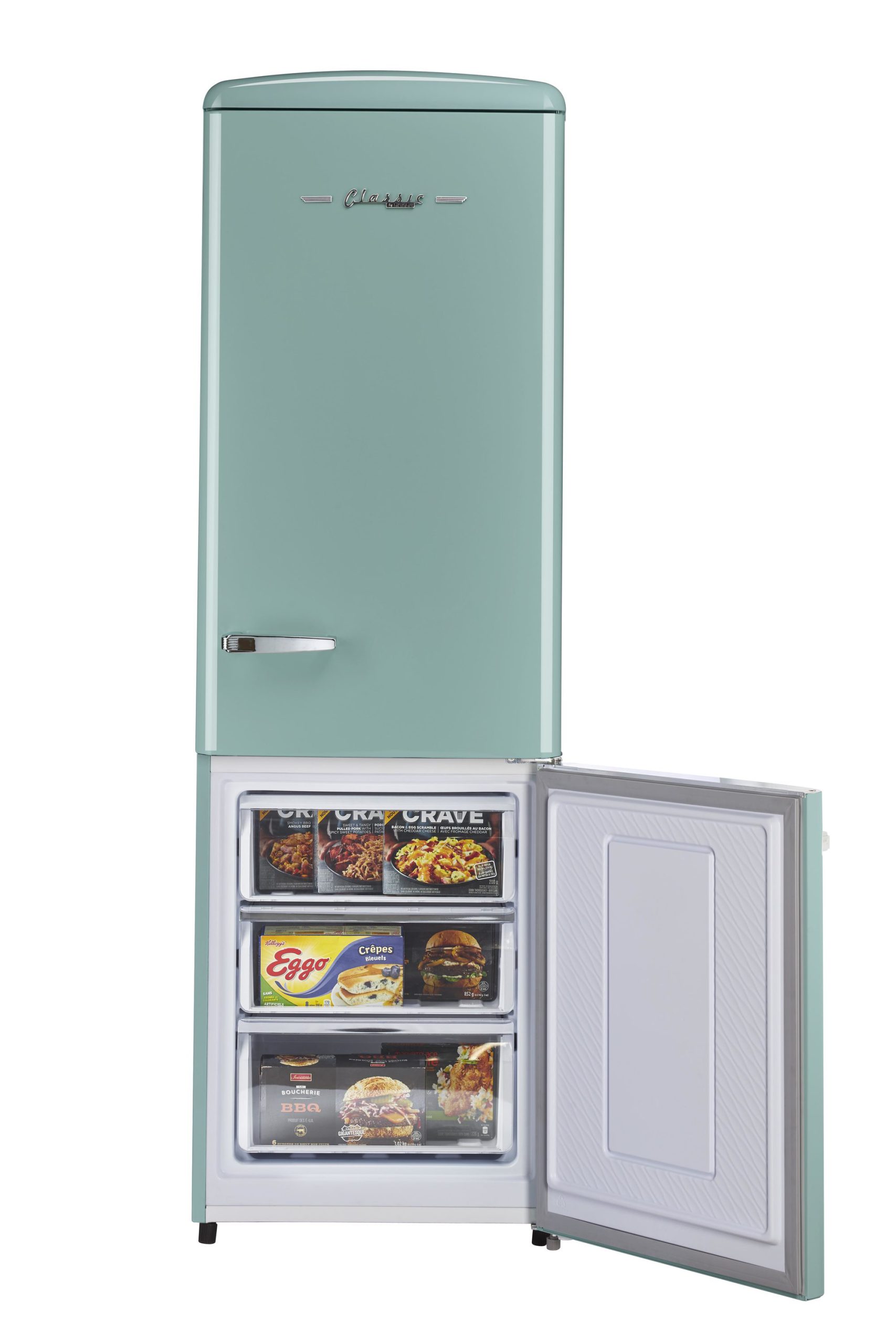 When you’re looking for more storage room, this 12 cu. Ft. Classic retro bottom-mount refrigerator comes with ample space to keep all your fresh and frozen foods, packaged in an eye-catching throwback design. Enjoy the ease of top-mounted fridge space that lets you reach in and find what you need without bending down. Plus the freezer bottom is designed to maximize storage for items you need less often.