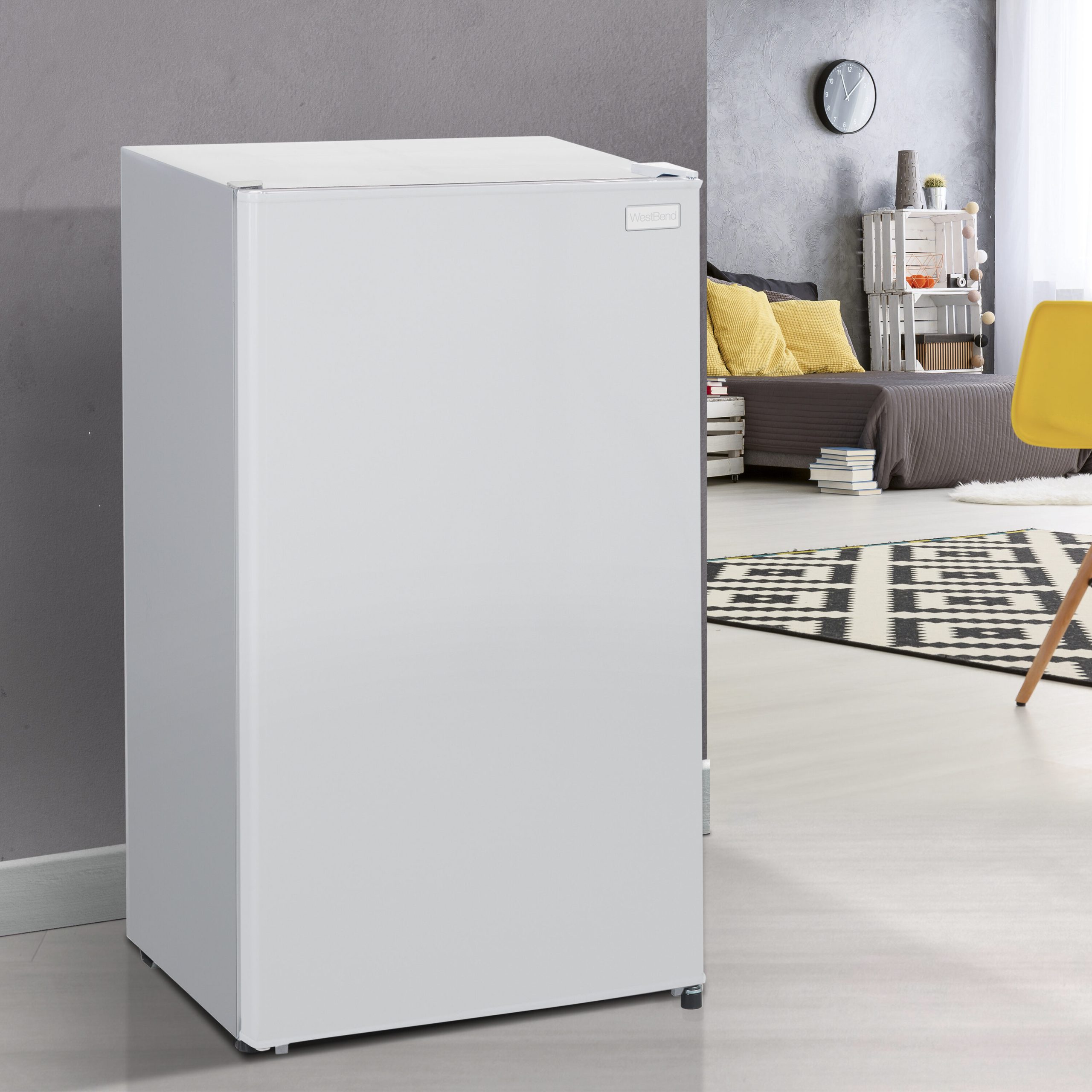 Keep your favorite beverages and snacks close by in the 3.3 cubic foot refrigerator from West Bend. Ideal for anywhere you need a little extra refrigerator space, the compact size makes it the perfect mini fridge for the office, dorm, man cave, she shed, bar, bedroom and more. Stock the mini fridge with bottled water and soda cans or try using it as a dedicated beer cooler or wine fridge. Adjustable door bins can accommodate 2 liter bottles as well as other drinks, condiments and more. Arrange the adjustable glass shelves to store salads, fruits, snacks and other food for easy access throughout the day. This white mini fridge features manual defrost, so your food and beverages remain fresh and cold. Select the right settings for your items with the full range temperature control. With a recessed door handle, flush back design and reversible door, this compact refrigerator is the perfect choice for any small space.