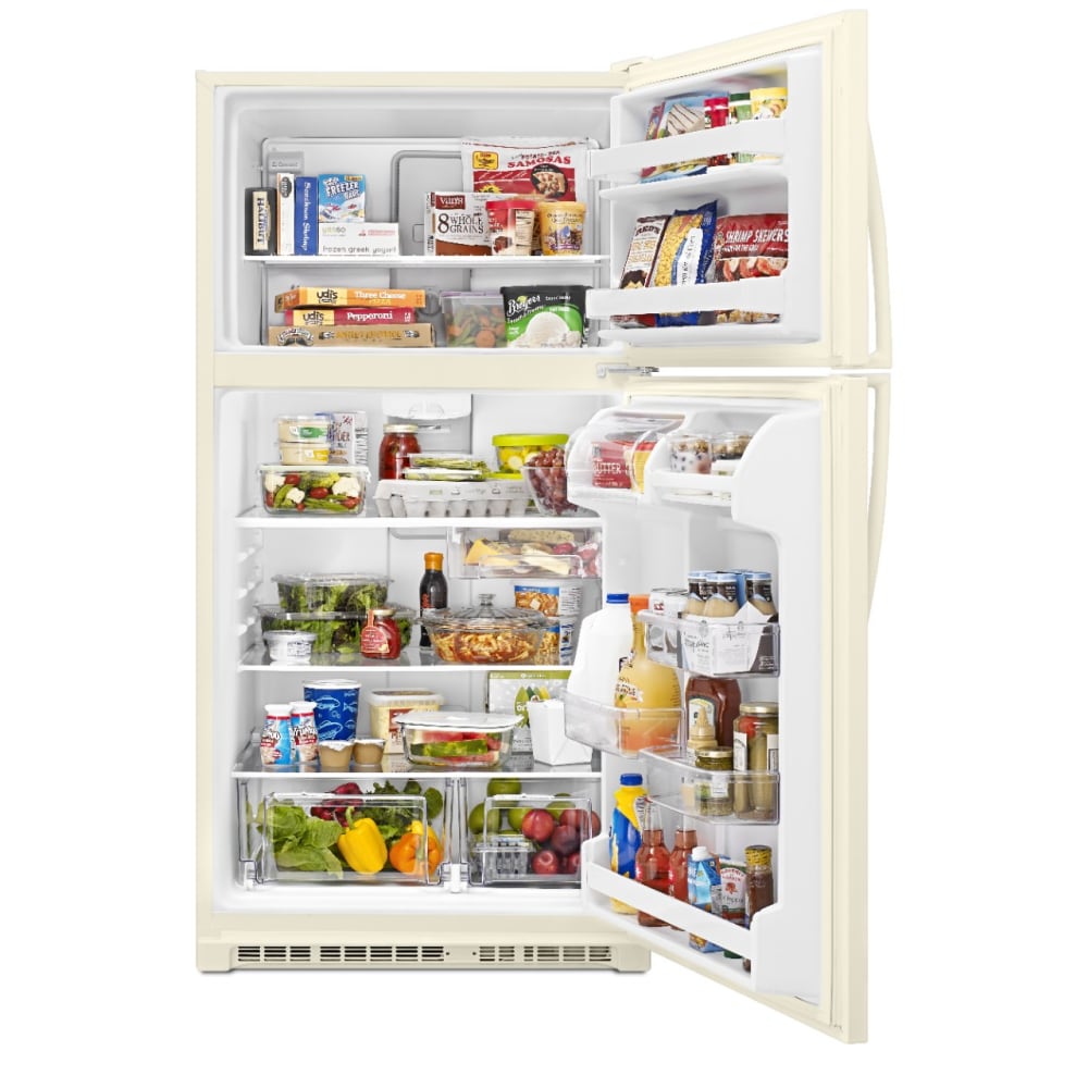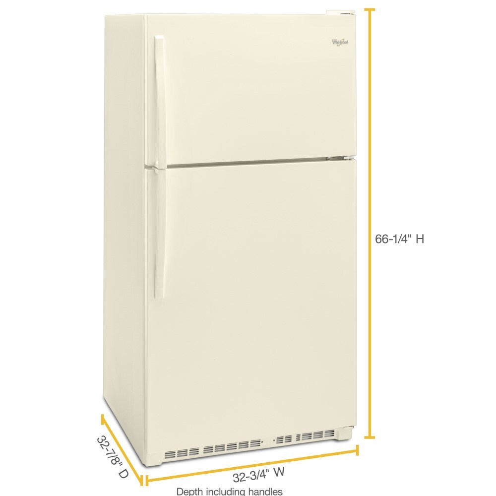 Do you like your freezer at eye level? This classic Whirlpool 20 cu top-freezer refrigerator is sized to fit the fresh foods, beverages, and frozen items your family loves. Purposeful storage features like a separate dairy bin and side bin that flexes to accommodate larger items simplify the task of figuring out where to put your groceries.