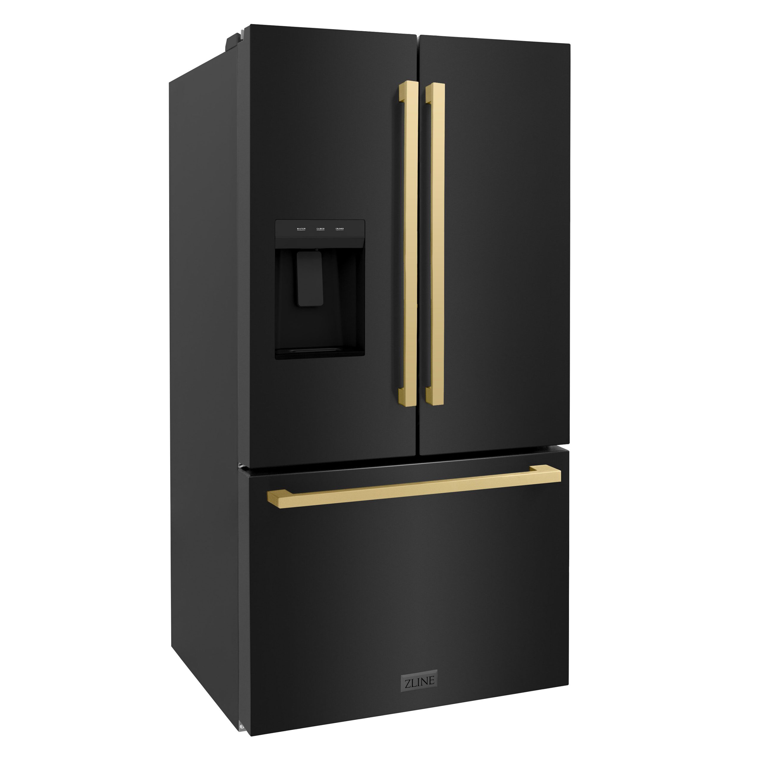 Luxury isn’t meant to be desired — it’s meant to be attainable. The ZLINE Autograph Edition 36 in. 28.9 cu. ft. Standard-Depth French Door External Water Dispenser Refrigerator with Dual Ice Maker in Fingerprint-Resistant Black Stainless Steel and Champagne Bronze Modern Handles (RSMZ-W36-BS-FCB) features a state-of-the-art cooling system, a professional built-in water and ice dispenser, and an expansive interior designed to store more items than ever before. With an elevated level of luxurious design, ZLINE Autograph Edition Standard-Depth Refrigerators are masterfully crafted to preserve more space for what matters.