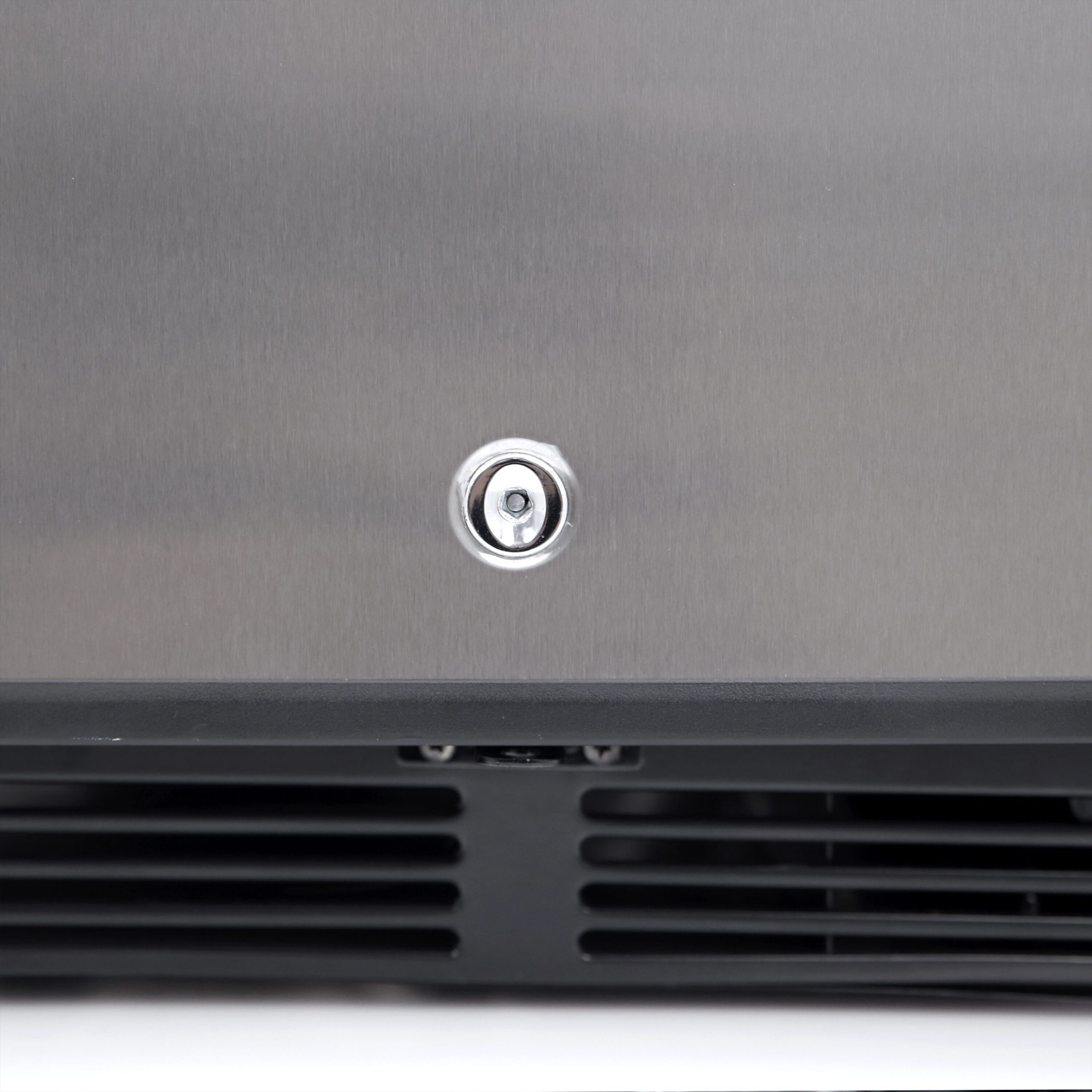 Keep your snacks and favorite beverages close by in the compact, 5.2 cubic foot black refrigerator with a stainless steel door from Avanti. The perfect lockable mini fridge for the office, dorm, man cave, she shed, bar, bedroom, or anywhere you need a little extra refrigerator space. The door shelves can accommodate 2 liter and gallon bottles, and six 12 ounce cans, as well as other drinks and condiments. Use the adjustable, removable glass shelving to arrange salads, fruits, snacks, and other foods for easy access throughout the day. This compact fridge features automatic defrost so your foods remain fresh and cold. Select the right settings for your items with the full range temperature control.
