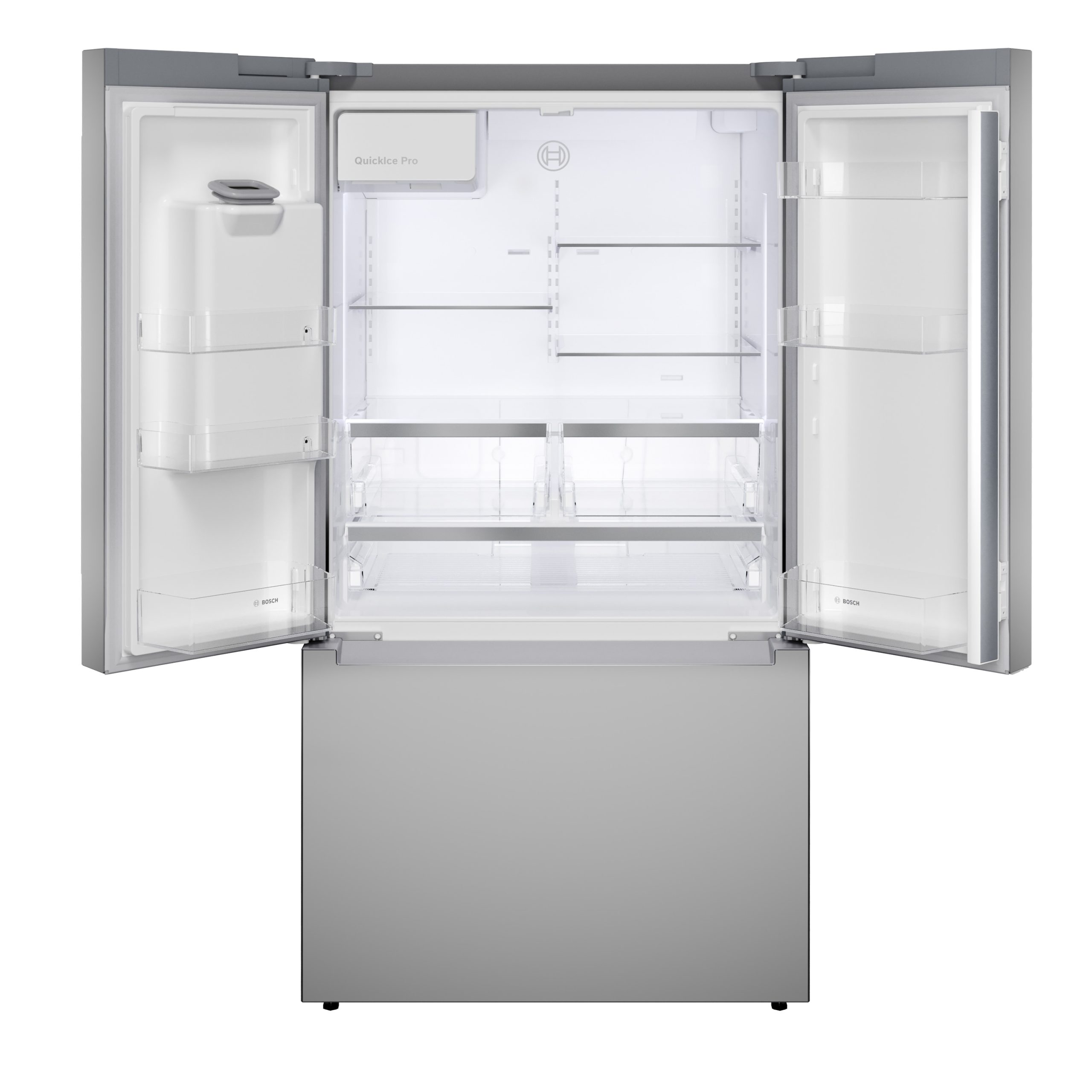 Introducing the Lowe’s Exclusive Bosch 300 Series standard-depth refrigerator, featuring the industry’s fastest refrigerator ice maker; Bosch’s QuickIcePro system produces 10 lbs of freshly filtered ice per day; The external ice and water dispenser also accommodates oversized drink containers; Based on single ice maker production rates during a 24-hour period, measured per IEC standard, manufacturer user’s manuals and product specifications, for brands identified in US Yipit Top 10 as freestanding French door bottom mount refrigerators.