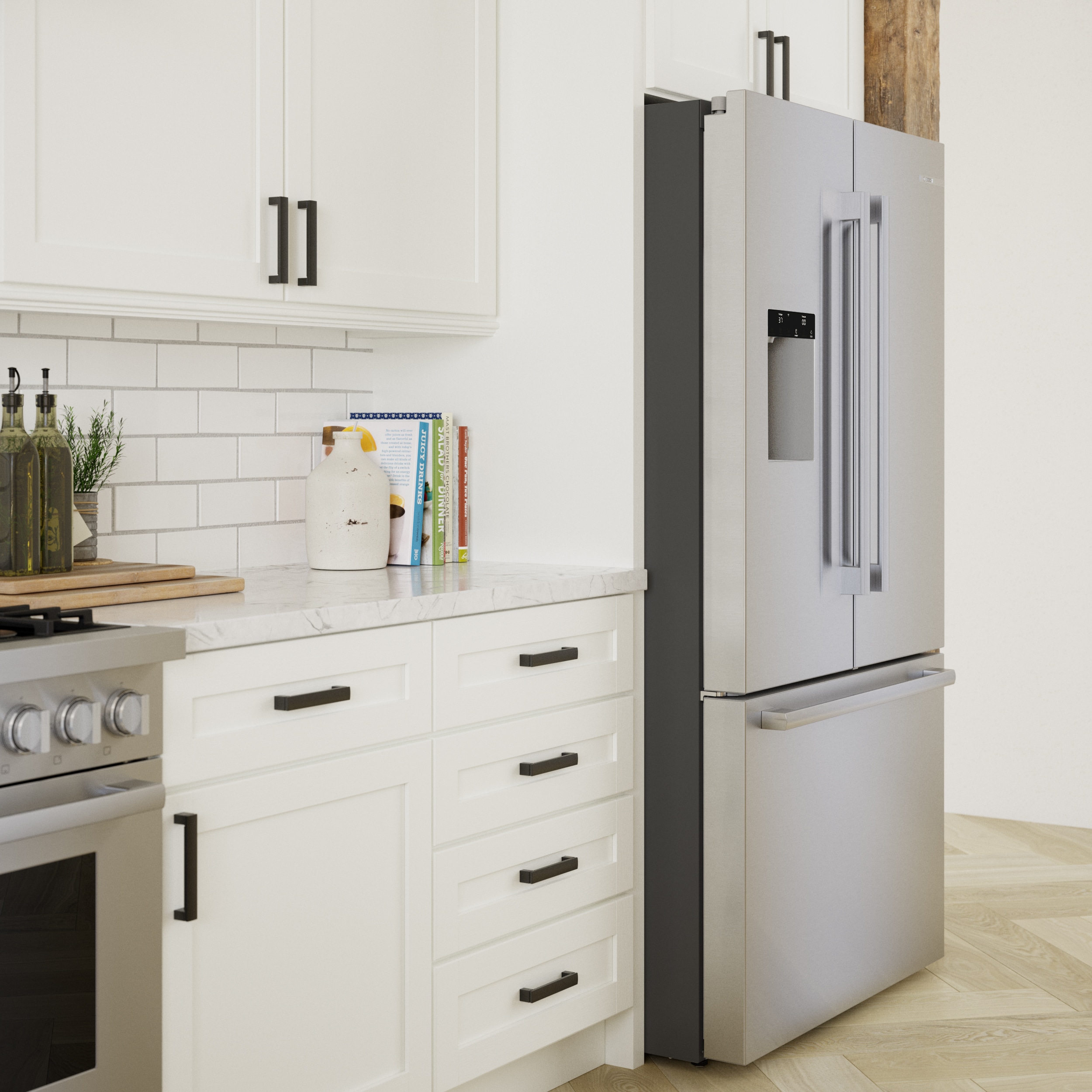 Never run out of ice with the QuickIce Pro System™, the industry’s fastest refrigerator ice maker*, producing 12 lbs. of ice per day. The external ice and water dispenser accomodates oversized drink containers, plus easy water refill with one touch bottle fill. Bosch’s new anti-fingerprint stainless steel prevents smudges and fingerprints. *Based on single ice maker production rates during a 24-hour period, measured per IEC standard, manufacturer user’s manuals and product specifications, for brands identified in US Yipit Top 10 as freestanding French door bottom mount refrigerators.