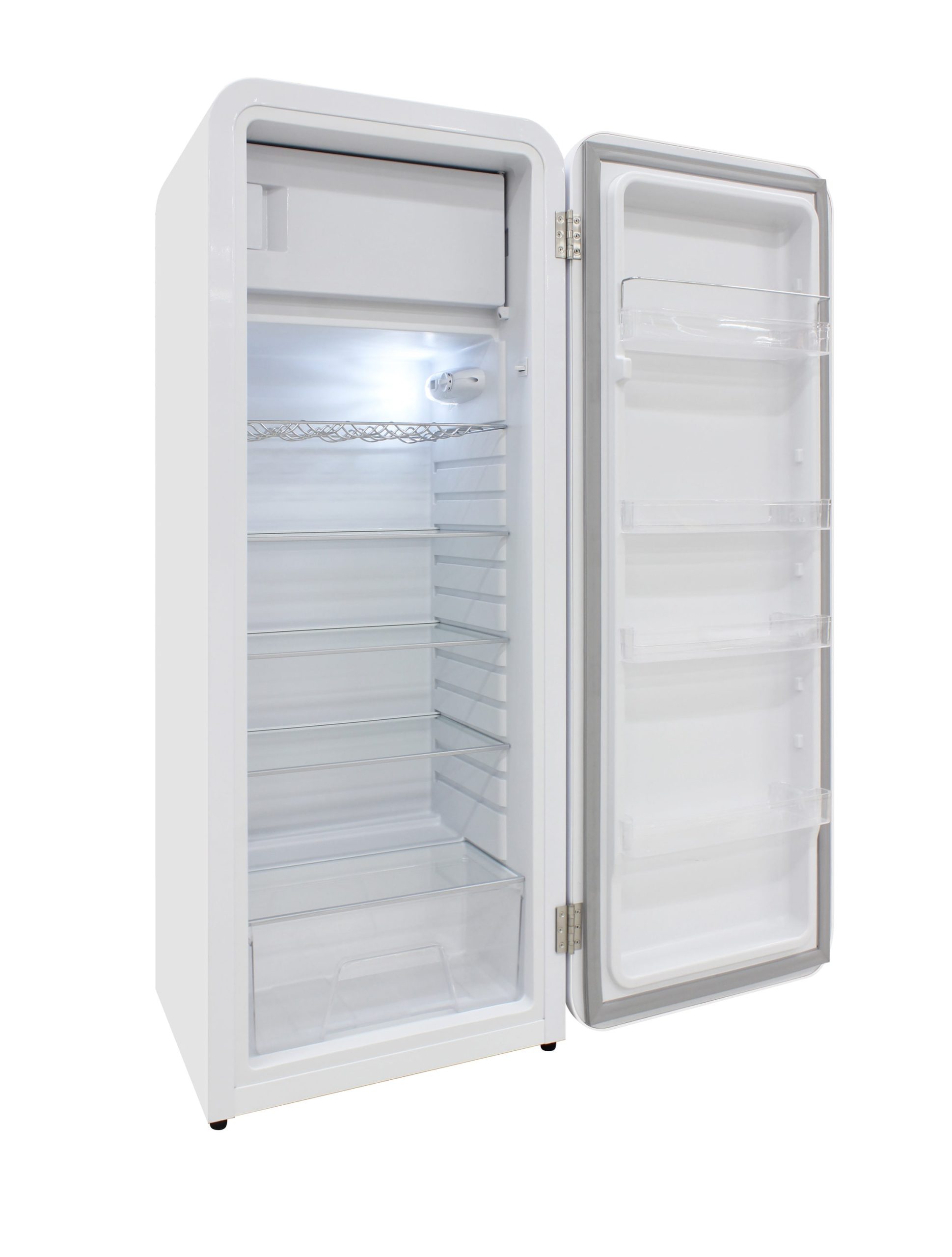 Keep all of your goods at the perfect serving temperature with the Brama Retro Refrigerator. This unit features a top freezer, interior light, open storage with 4 pull-out shelves including one metal wire racking, bottom bulk storage, and 4 rows of small storage behind the door. The white, rounded exterior with solid steel door gives a retro and modern look and makes a perfect addition to to any space.