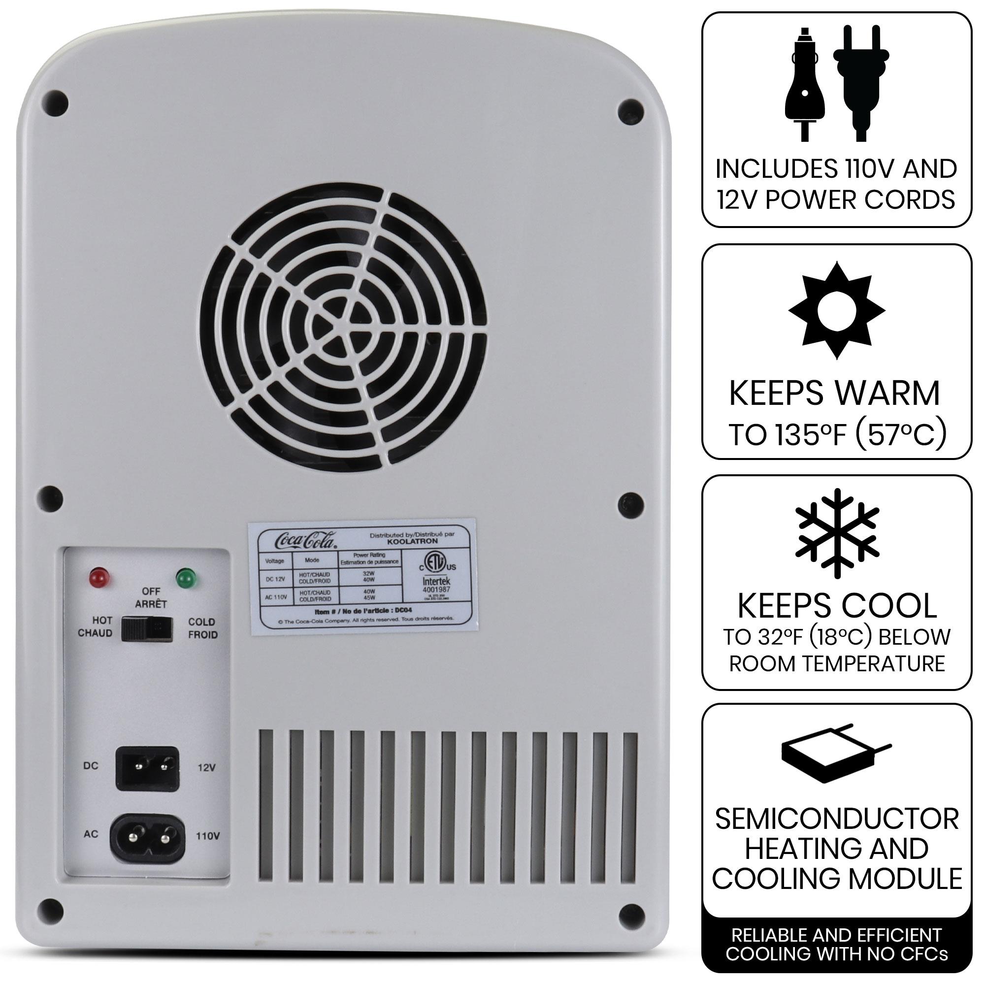 Just for the taste of it! This sleek gray 6 can mini fridge featuring the famous Diet Coke logo is a must-have for fans and collectors. Efficient thermoelectric technology with AC and DC adapters lets you chill your favorite soda and snacks or warm your lunch at home or on the road, and its compact size makes it the perfect accessory for your home, office, dorm, or RV.