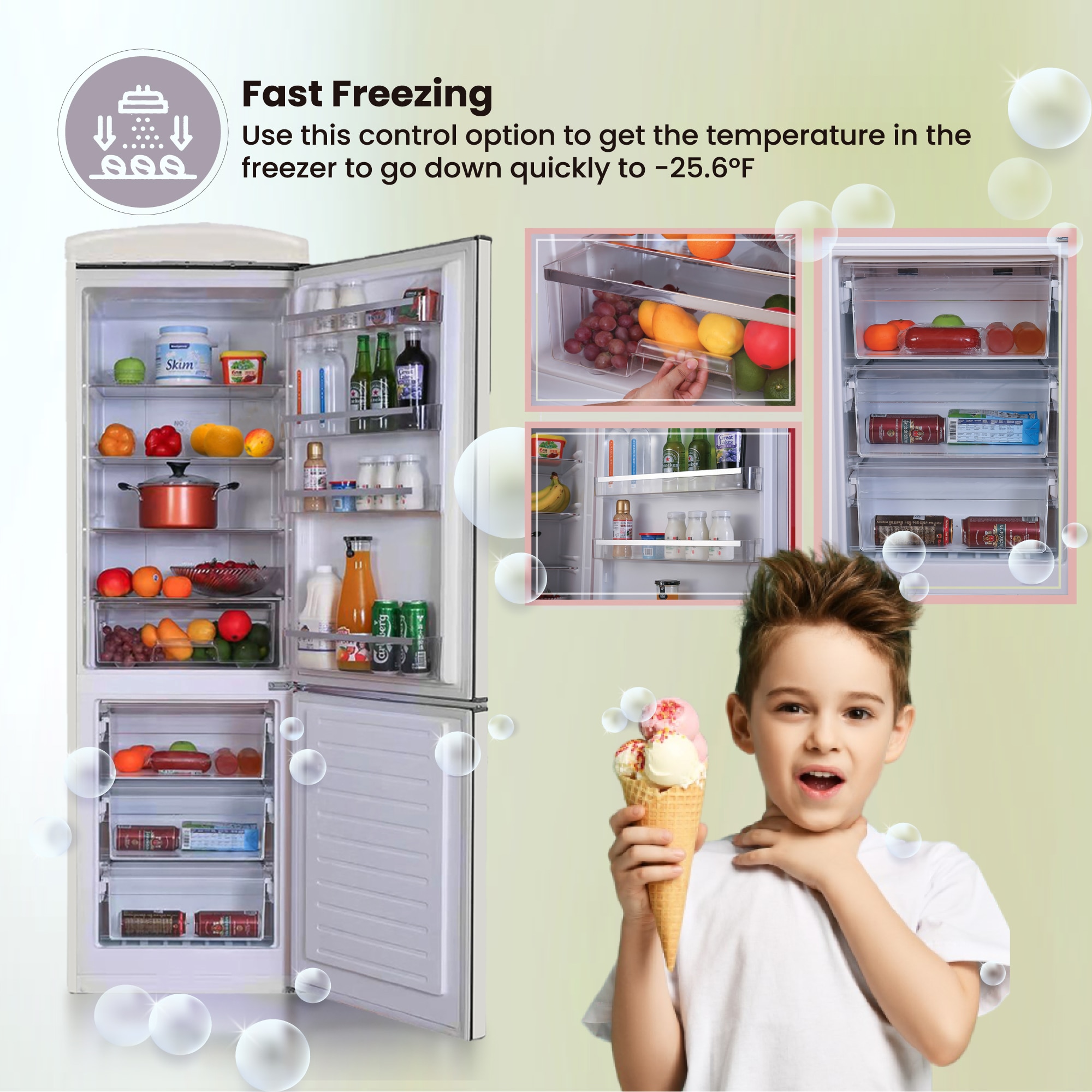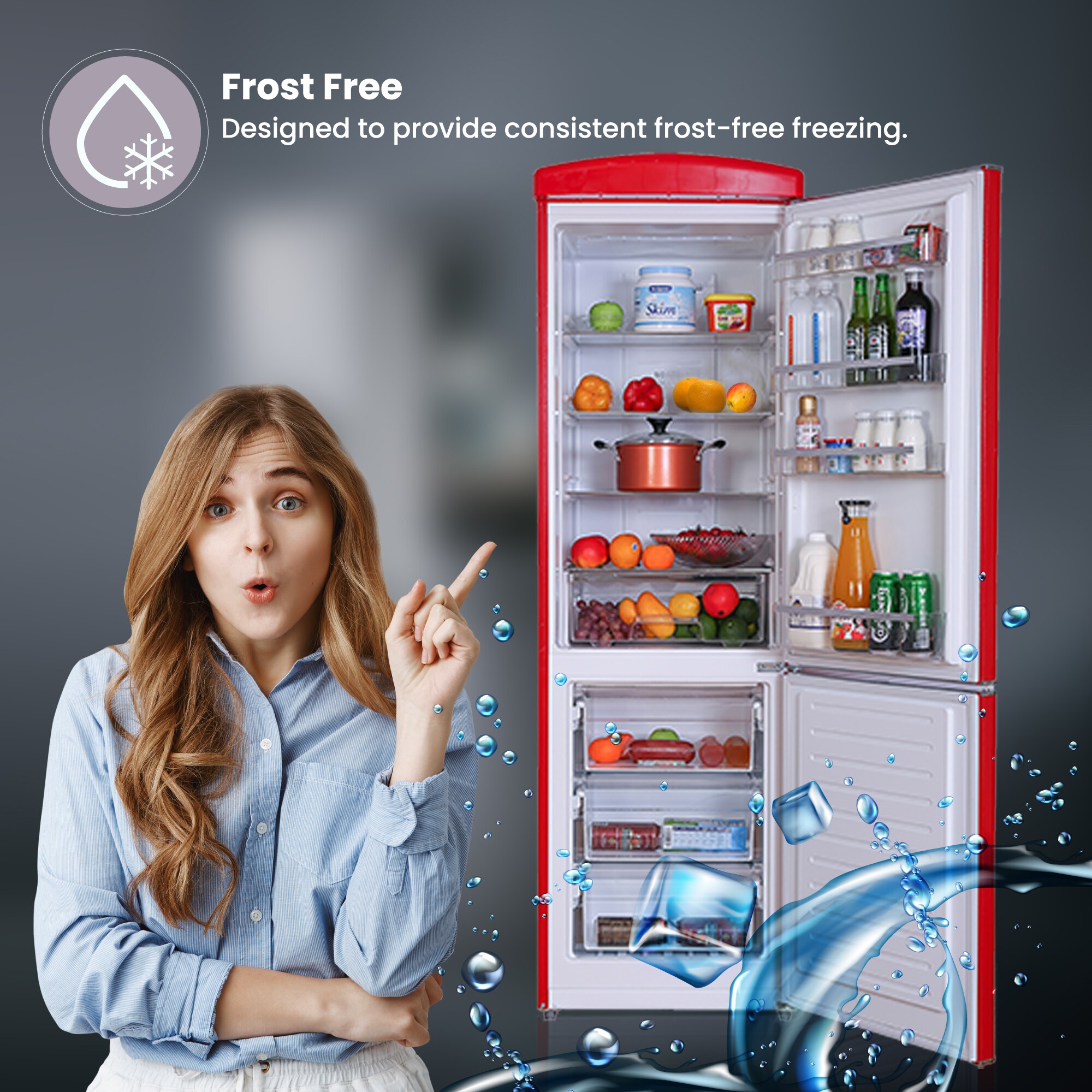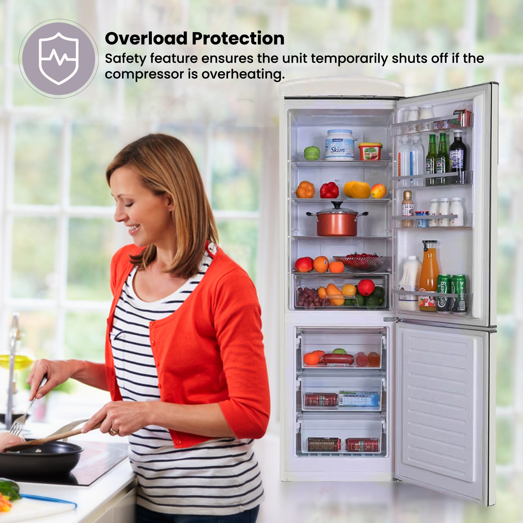The Conserv Two Door retro 10.7 cu. ft. bottom mount refrigerator is the perfect combination of style and function to keep your food fresh in a compact space. Available in retro red, black, and cream exterior colors, the slimline refrigerator comes with 3 glass shelves in the refrigerator section and 3 freezer bins to keep freezer items organized for easy access. The Conserv retro refrigerator also comes with 4 door racks and electronic temperature controls with Fast Cool and fast Freeze options to bring temperatures down quickly. The attractive freestanding refrigerator measures 77 x 24 x 28 inches and is equipped with an interior LED light for convenient illumination of stored food items. It uses R600a refrigerant and 110V electricity and is et certified and protected by Conserv’s 1 Year Parts and Labor warranty.