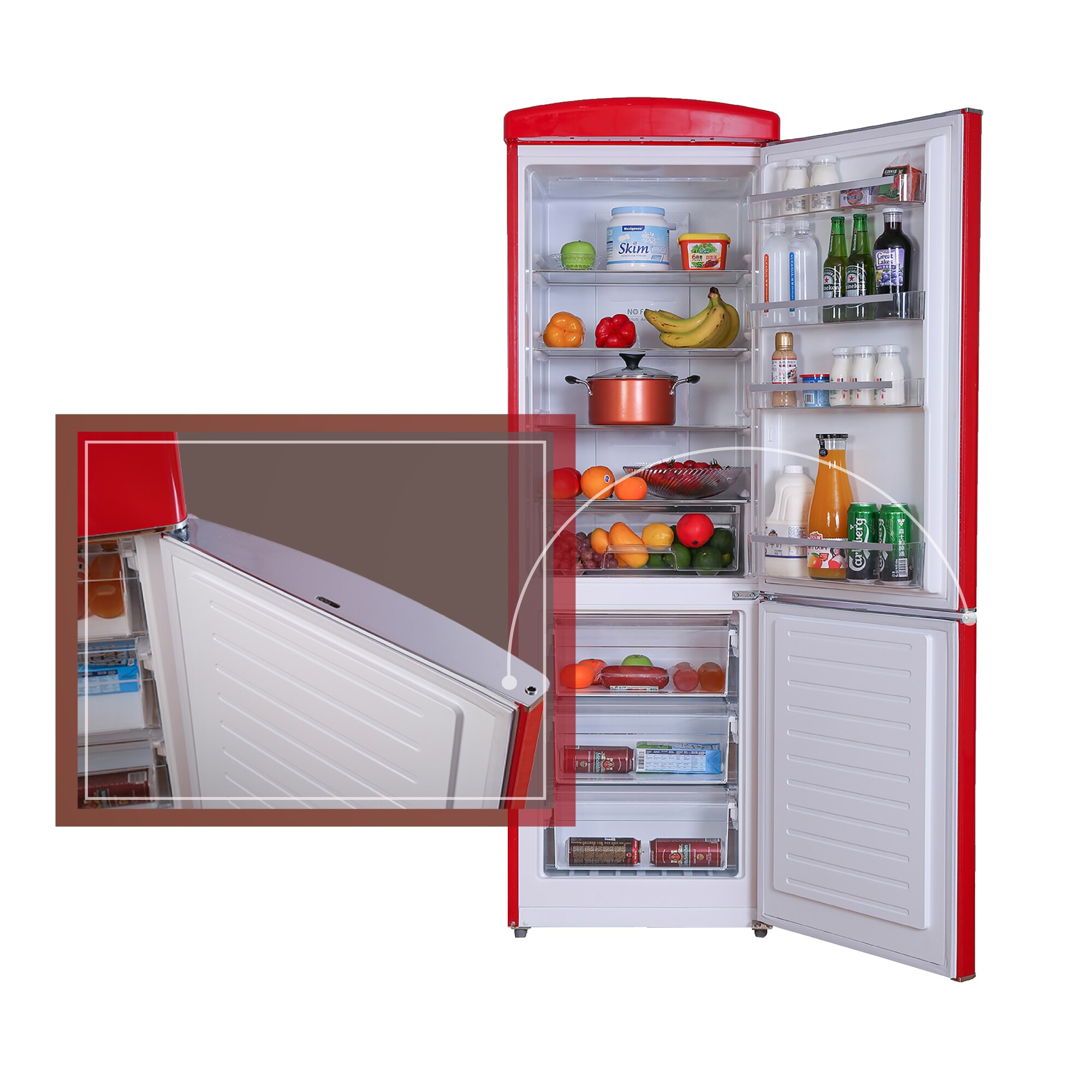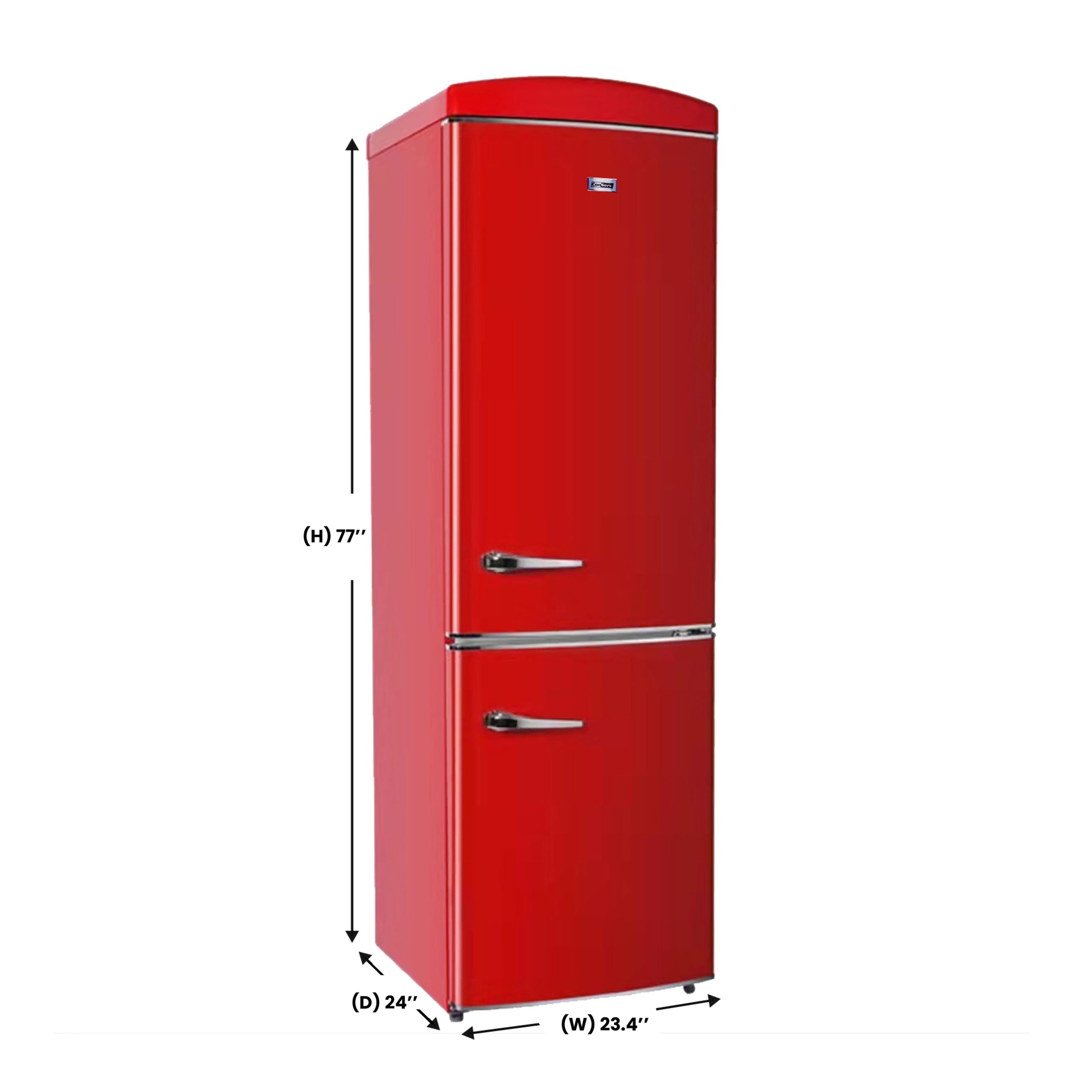 The Conserv Two Door retro 10.7 cu. ft. bottom mount refrigerator is the perfect combination of style and function to keep your food fresh in a compact space. Available in retro red, black, and cream exterior colors, the slimline refrigerator comes with 3 glass shelves in the refrigerator section and 3 freezer bins to keep freezer items organized for easy access. The Conserv retro refrigerator also comes with 4 door racks and electronic temperature controls with Fast Cool and fast Freeze options to bring temperatures down quickly. The attractive freestanding refrigerator measures 77 x 24 x 28 inches and is equipped with an interior LED light for convenient illumination of stored food items. It uses R600a refrigerant and 110V electricity and is et certified and protected by Conserv. 1 Year Parts and Labor warranty.