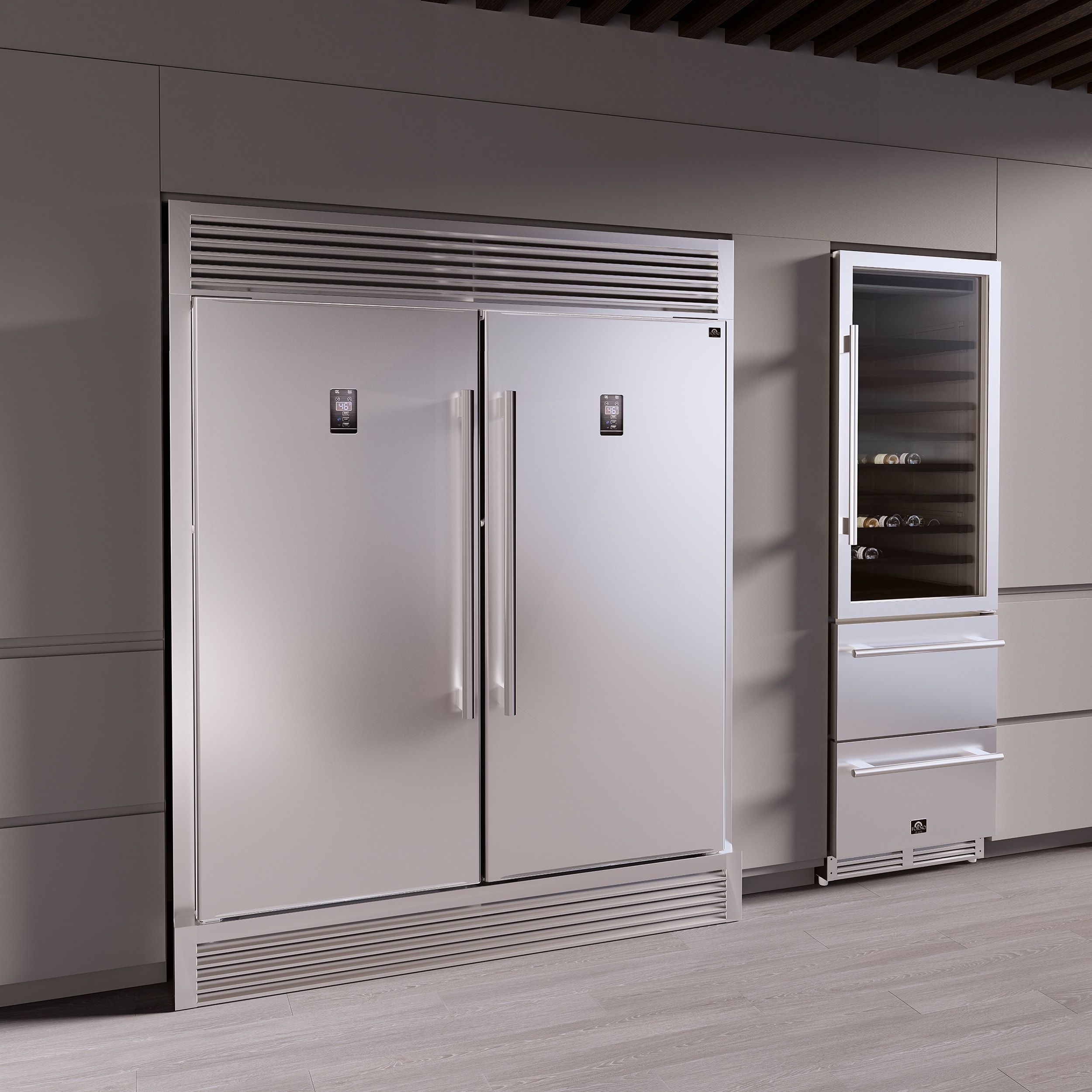 The two 28-inch Rizzuto, combined with decorative trim grill, extends to a width of 60 inches and giving it a built-in appearance