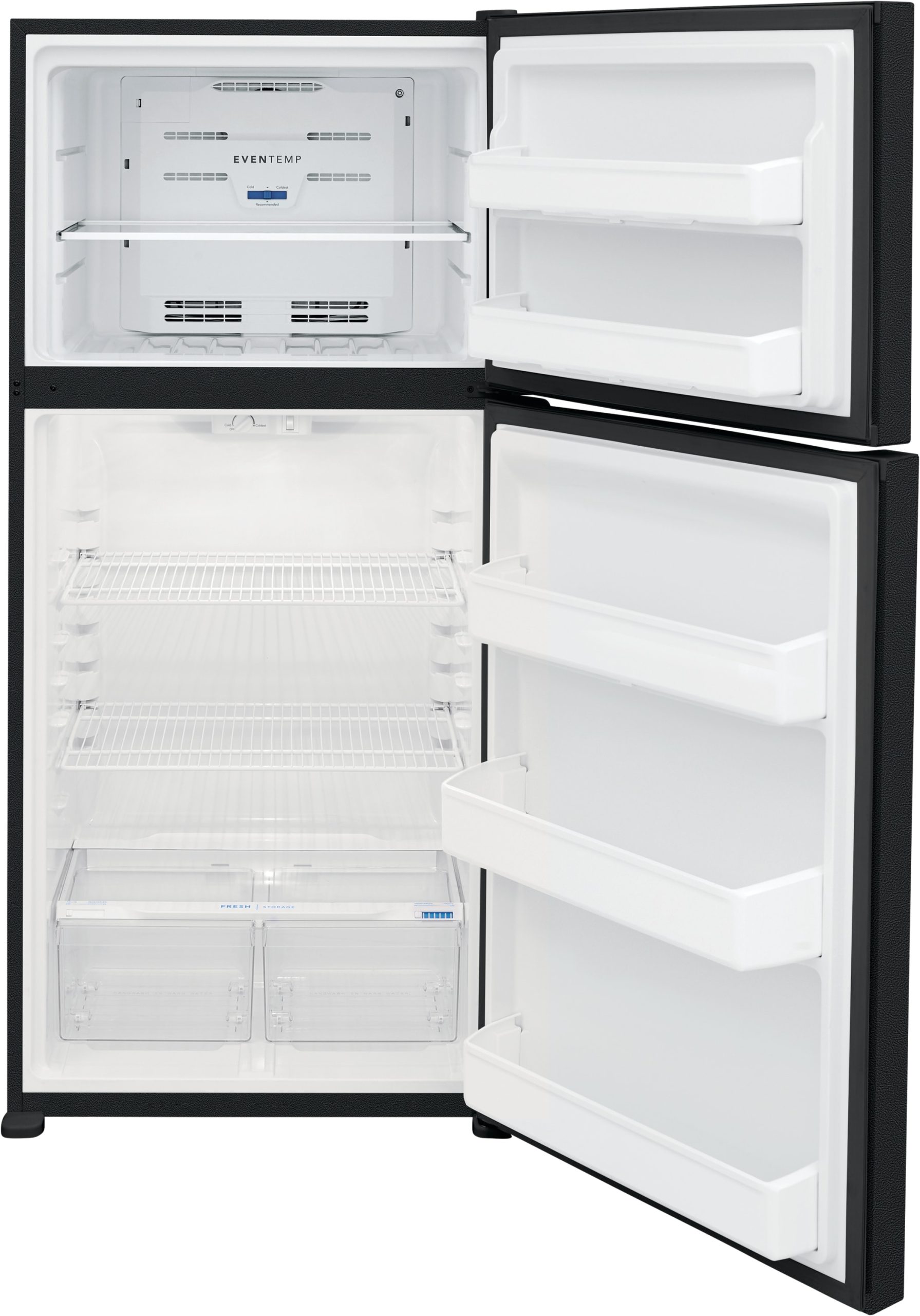 This Frigidaire 18 cu ft top freezer refrigerator offers a timeless style with the latest cooling technology. Our EvenTemp™ Cooling System prevents unwanted freezing by optimizing airflow and ensures a consistent temperature throughout your refrigerator. The spacious interior storage enables you to easily organize your family’s favorites with two wire shelves, spacious door bins, and a full-width glass freezer shelf.