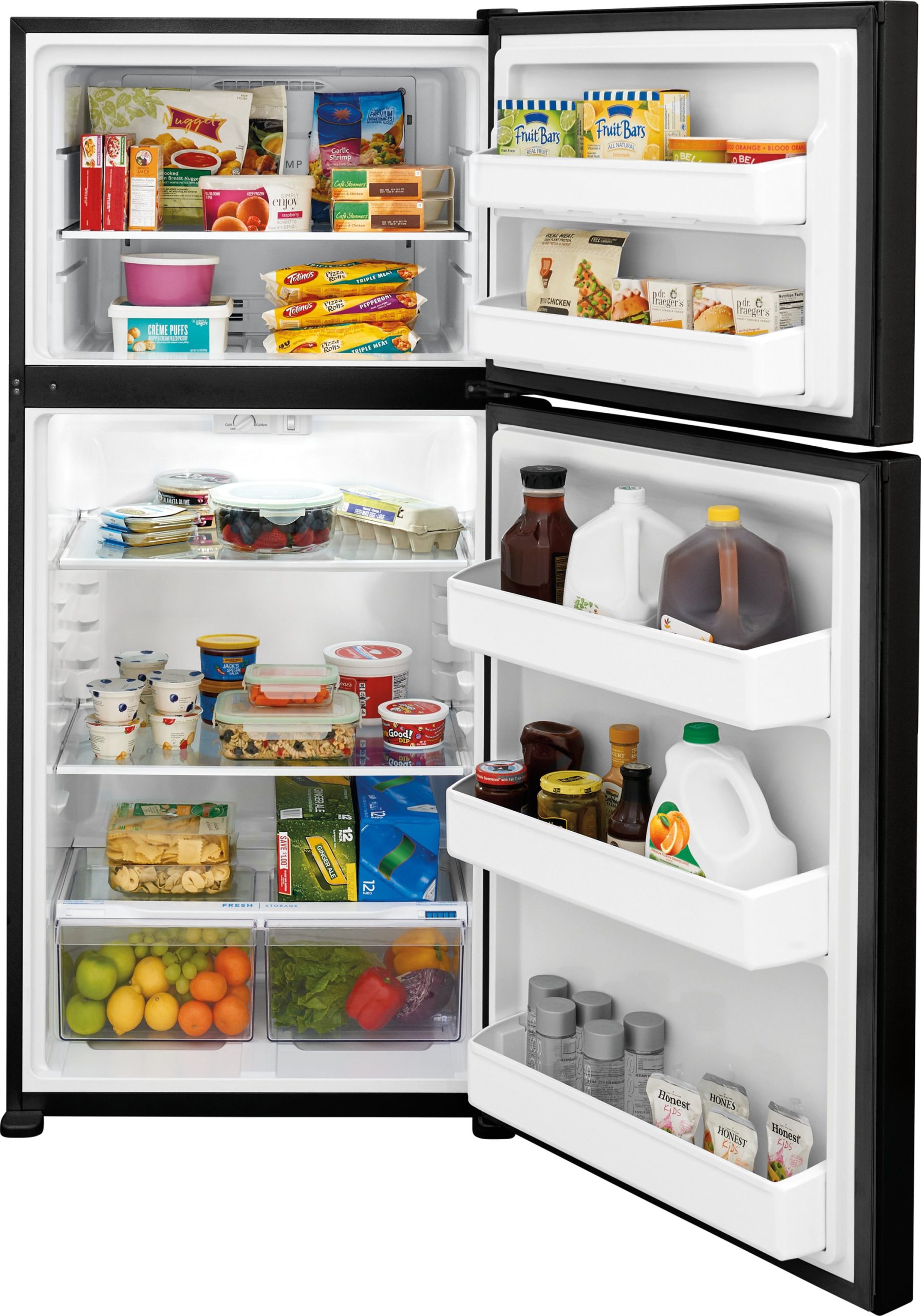 This Frigidaire 18 cu. ft. top freezer refrigerator includes spacious interior storage options designed for busy families, including generous door bins and adjustable full-width glass shelving. Our humidity-controlled crispers keep produce fresh for longer, allowing you to waste less and save money.