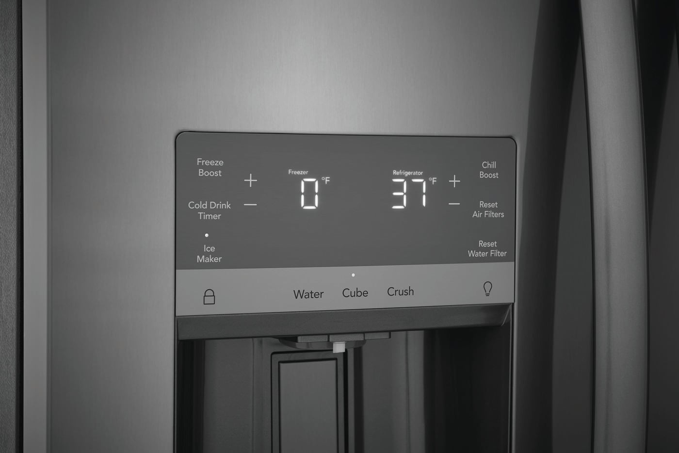 This 22.3 cu ft Frigidaire Gallery side by side refrigerator helps prevent produce from spoiling with our advanced CrispSeal Plus Crisper technology that keeps produce fresh, plus an added filter reduces the gas that causes produce to ripen faster. Keep your food fresh and reduce freezer burn with our variable speed compressor (EvenTemp Cooling System) that reacts quickly to temperature fluctuations and constantly circulates cold air throughout the fresh food and freezer compartments. Find a place for everything with our flexible organization system, including three removable, dishwasher-safe glass shelves, adjustable gallon door bin, and a slim design ice maker that holds 9 pounds of ice without taking up valuable shelf space.
