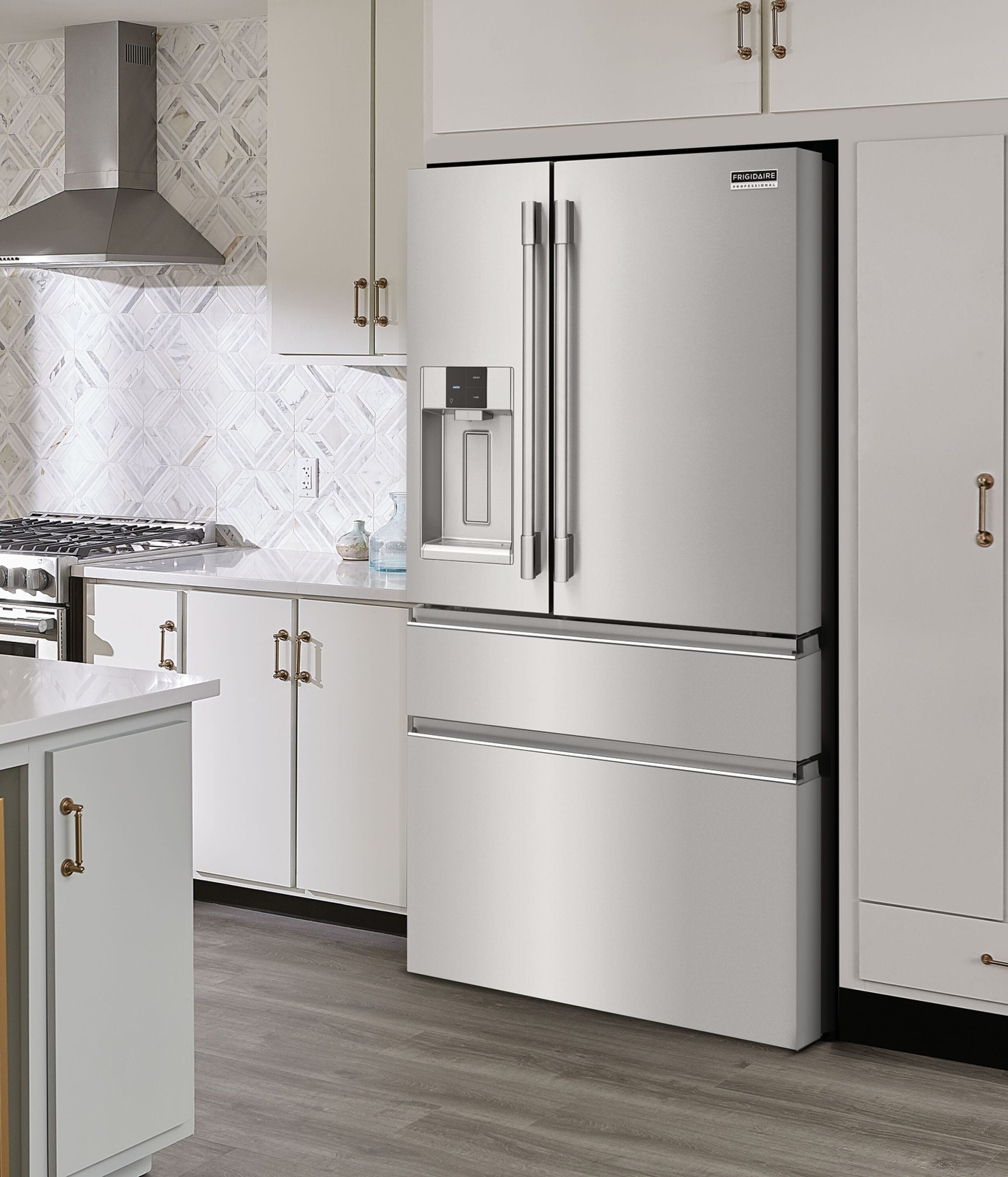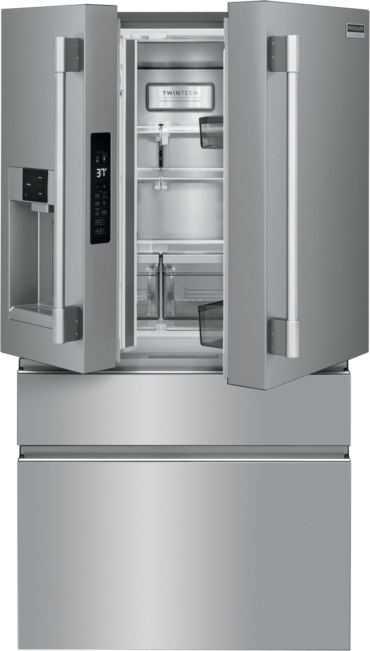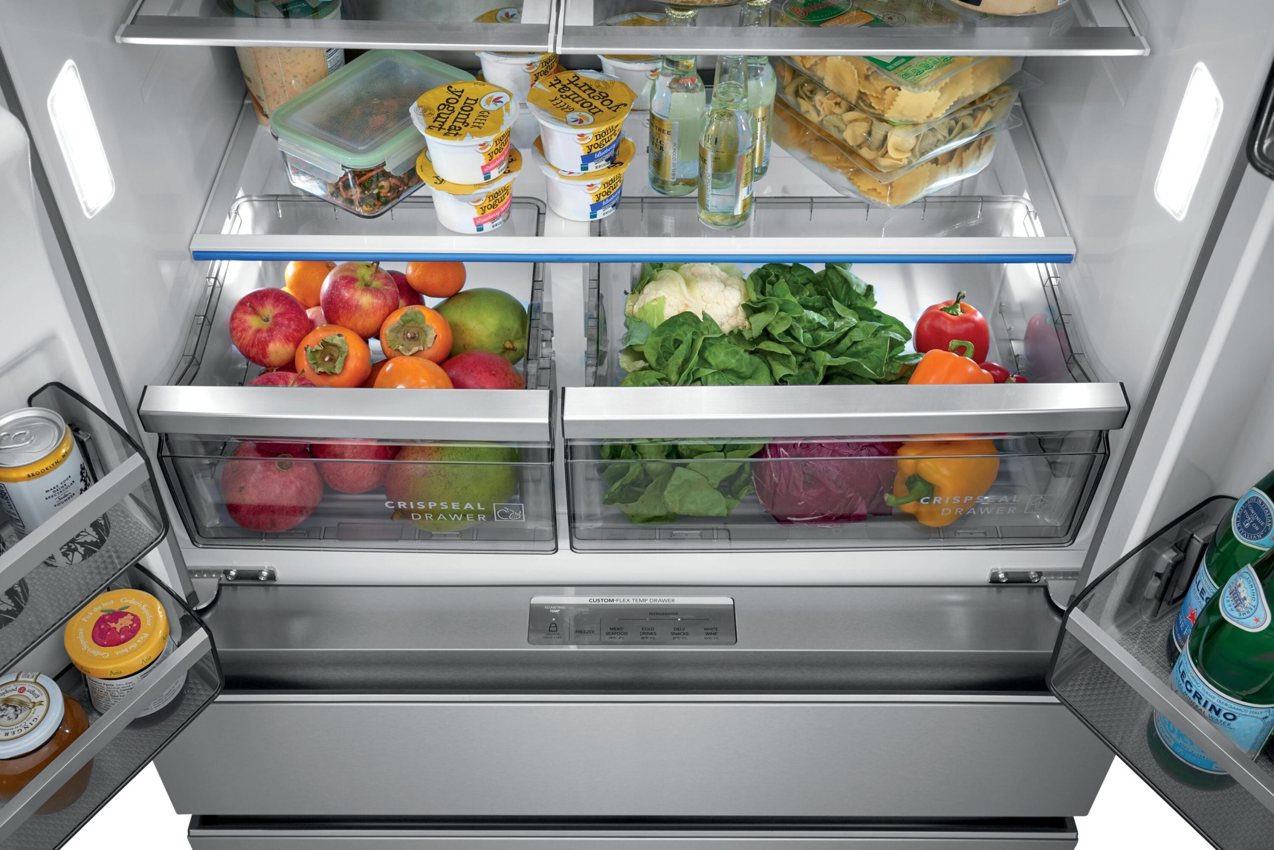 This Frigidaire four-door French door refrigerator offers the Custom-Flex® Temp Drawer, the only drawer available that fully switches from frig to freezer, so you can store all your family favorites from yogurt to frozen pizza. It helps keep fruits and vegetables fresh longer with CrispSeal® crispers, and it’s easy to organize and clean with SpaceWise® organization system and Smudge-Proof® stainless steel.