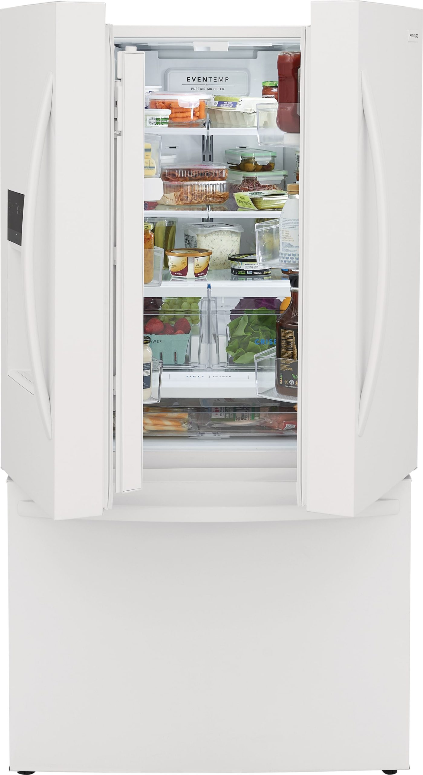 This Frigidaire French door refrigerator helps keep fruits and vegetables fresh longer with CrispSeal® crispers which blocks dry air from entering your crisper to avoid premature shriveling. Easily stay organized with a full width deli drawer and large door bin storage. Keep safe, great tasting water flowing. Our filter reduces up to 99% of contaminants, cuts back on plastic and saves the cost of bottled water (NSF and WQA certified).
