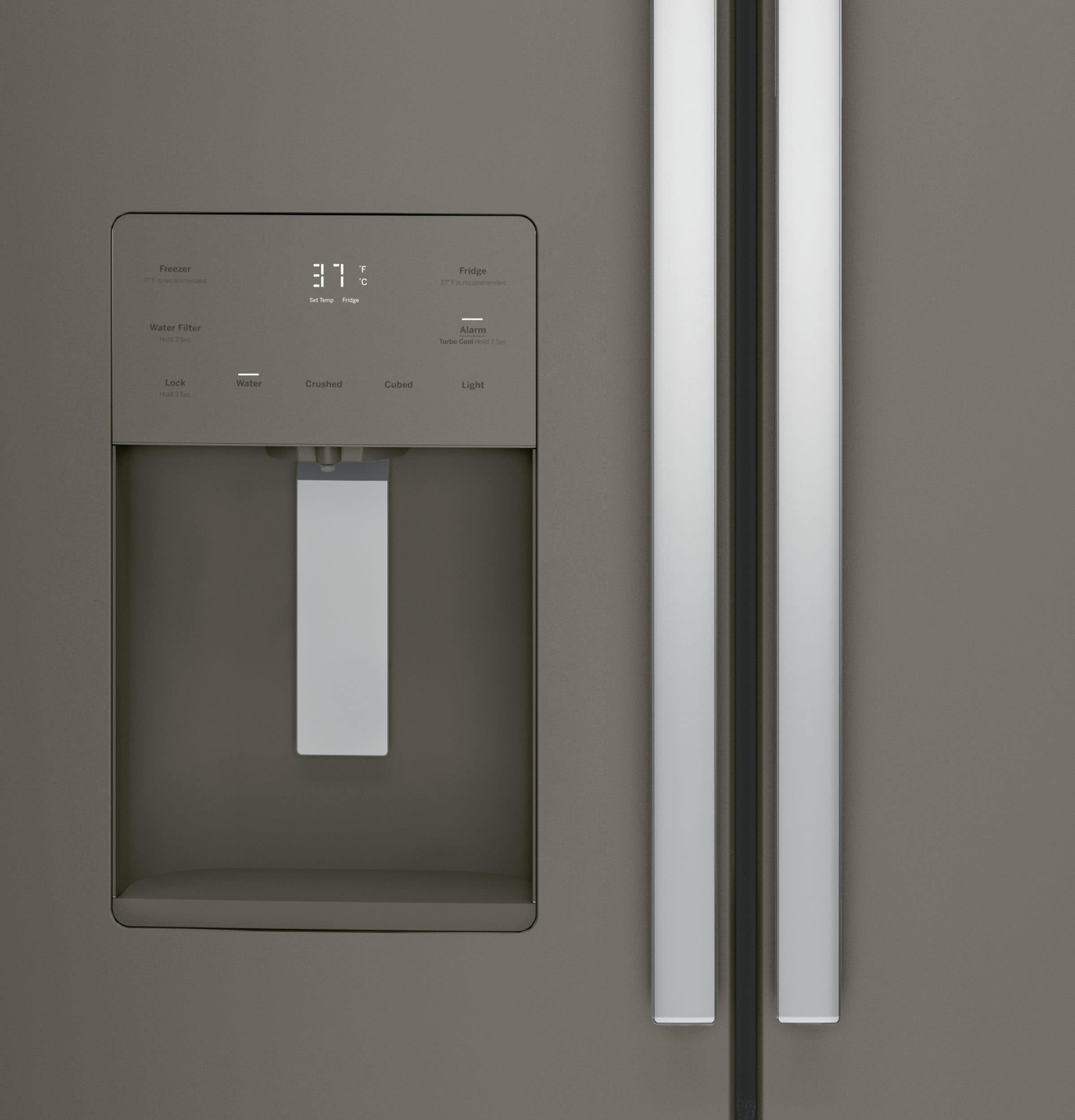 Color-matched external ice and water dispenser – fills tall bottles, stores and makes ice on the door, saving space