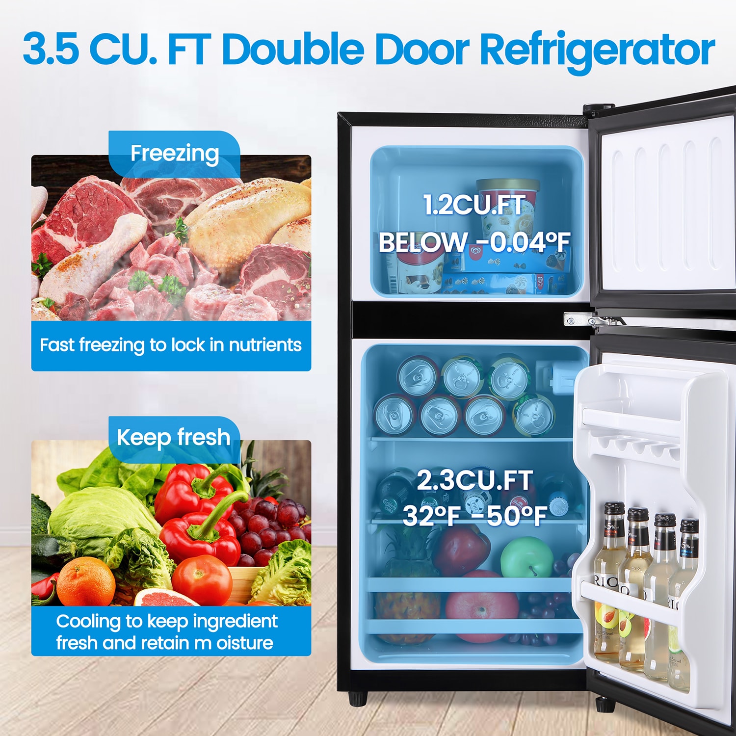This 3.5 cu.ft mini fridge is ideal for use in bedrooms, offices, apartments and bars. Double circulation zone cooling and double circulation zone cooling can isolate the outside heat, effectively maintain the temperature in the box, and improve the effect of food preservation. When the ambient temperature is below 0 degree, turn on the switch to make the refrigerator work passively, so that the temperature of the freezer is kept in the state of low temperature freezing. Double door design can keep fresh ingredients, lock food moisture, fruits and vegetables, drinks, snacks, etc. Fast refrigeration to lock in the nutrients of the ingredients; Storage: Fish, seafood, meat, ice cream, etc.