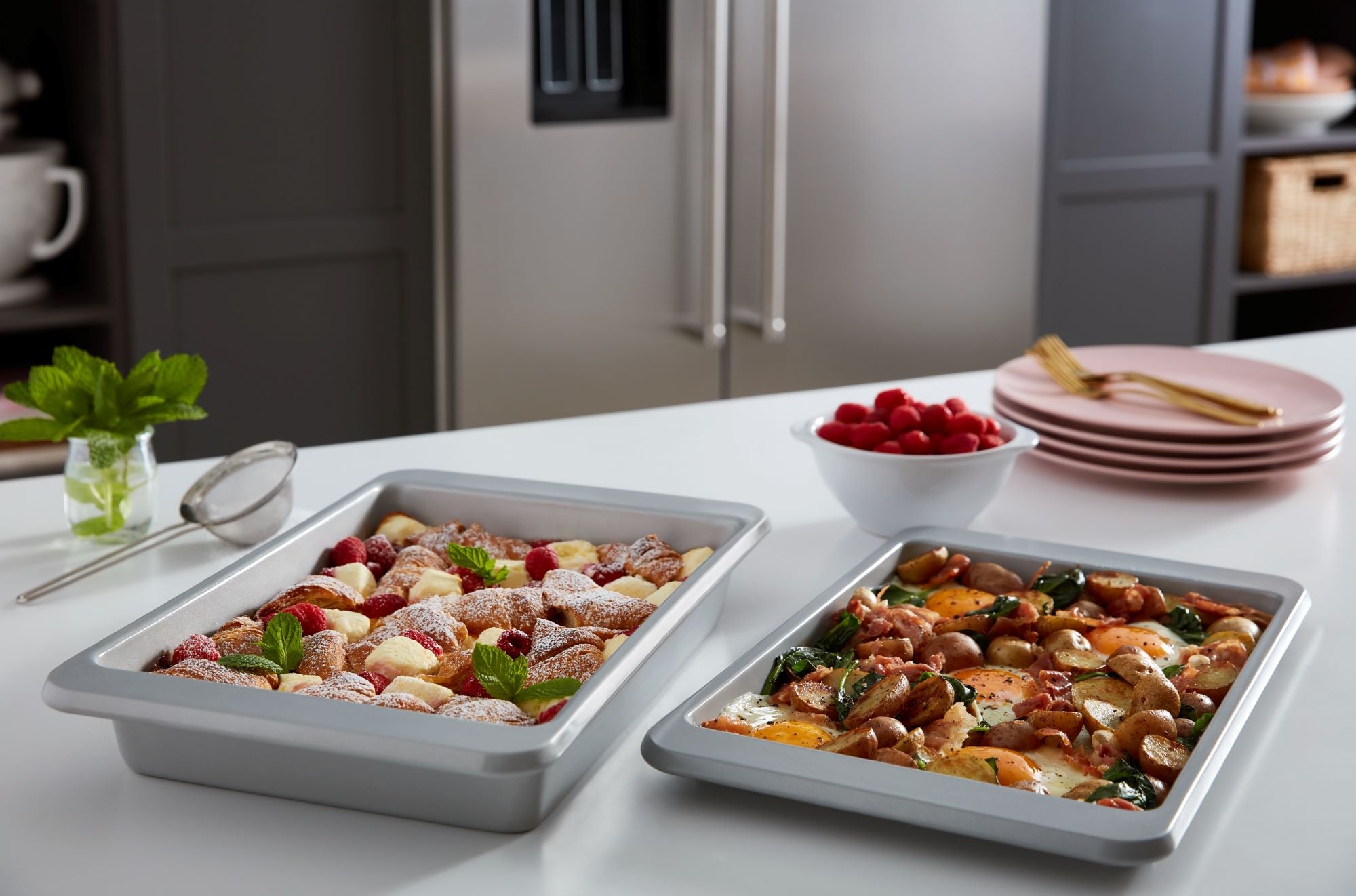 Under-Shelf Prep Zone utilizes unused space with included 9-in x13-in baking sheet and cake pan