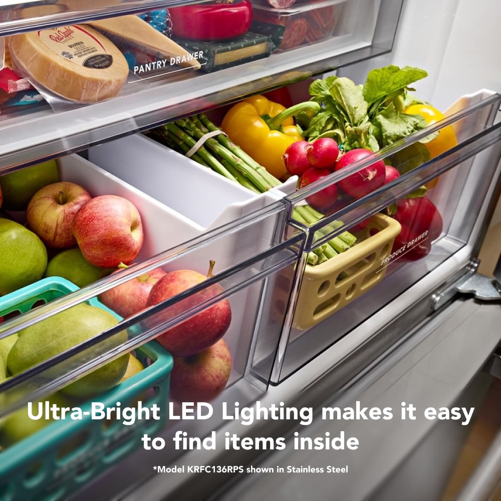 Enjoy freshness within reach. This KitchenAid® counter-depth French door refrigerator features an Interior Water Dispenser to keep the outside looking sleek. Get customizable storage with an adjustable Wood-Look Nesting Shelf and convenient space for wide items with a Full-Width Pantry Drawer. And the Counter-Depth Design allows the refrigerator to fit nearly flush with surrounding cabinetry, offering a built-in look and more room to move in your kitchen.