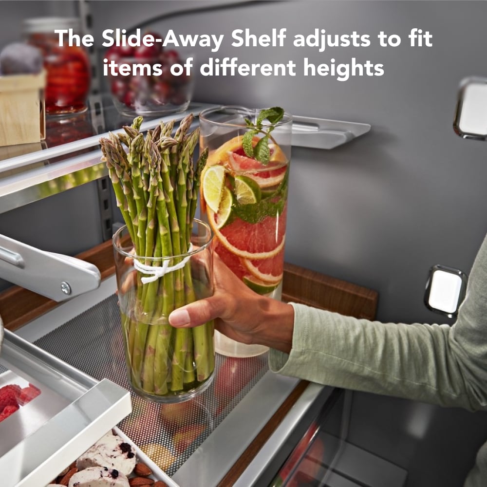 This standard-depth French door refrigerator from KitchenAid® brand keeps ingredients fresh and in easy reach with specialized spaces that make room for everything from salmon to sangria. A Sliding Storage Tray fits platters and casserole dishes without stacking, while a Slide-Away Shelf adjusts to accommodate tall pitchers and carafes. Plus, the ExtendFresh™ Temperature Management System maintains optimal temperatures for fresh and frozen foods.