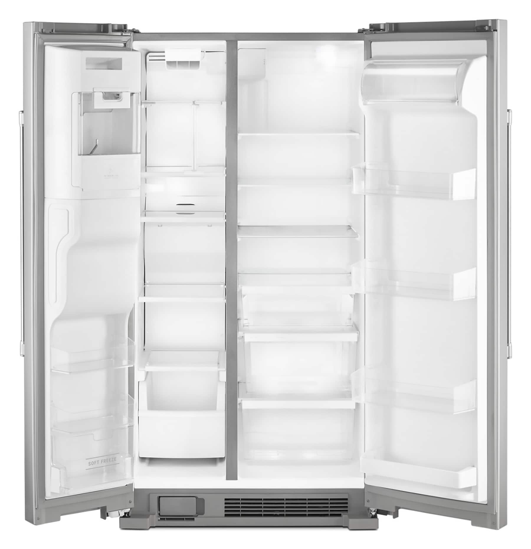 This side-by-side refrigerator is built tough and easy-to-clean with its fingerprint resistant stainless steel finish. Built with plenty of storage options, including a specially designed soft freeze bin that puts you in control of the way foods freeze. Put in a pint of ice cream and it’s soft enough to scoop. Frozen pizza storage stores two frozen pizza boxes upright and out of the way, so quick meals are an easy grab. The distinct and durable Signature Maytag® metal shelf adds a bold look to the inside. With an exterior ice and water dispenser for easy access, plus a 10-year limited parts warranty on the compressor, this side-by-side fridge will keep it all cool for years and years.
