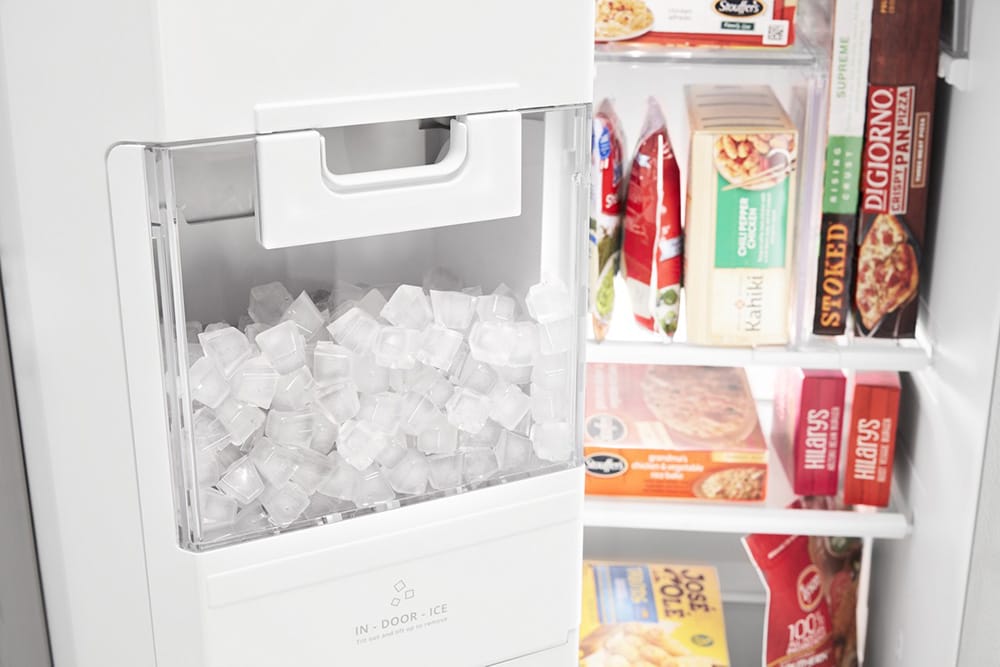 Store-N-Door® ice dispensing system frees up shelf space in the freezer, creating more room for tall items on the shelf Plus, the bin is removable, so it’s perfect to use for filling large containers like blenders and coolers
