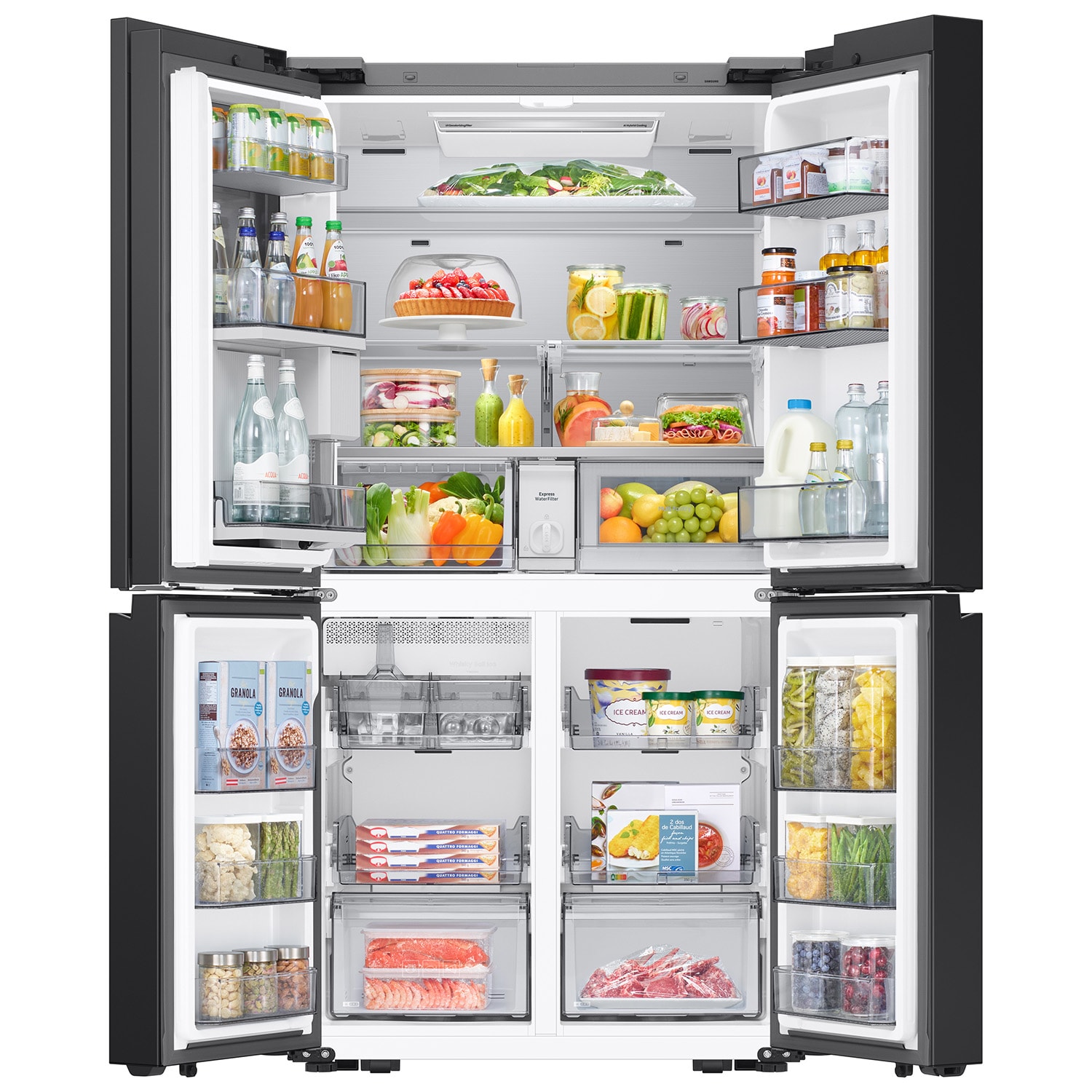 Samsung’s 23 cu. ft. Bespoke 4-Door Counter-Depth French Door Refrigerator with changeable door panel(Changeable door panels are sold separately); keeps your food fresh for longer while using less energy with AI Hybrid Cooling(The Peltier element moderates energy use and temperature (eg., shuts off AI Inverter Compressor) when internal temperatures rise above normal or AI predicts a temperature rise within 5 minutes); It comes with the Dual Ice Maker which offers two ice options: cubed ice and Sphere Ice; Plus, the FlexZone™ Drawer lets you customize the temperature of the middle drawer to fit your needs, with five adjustable settings.