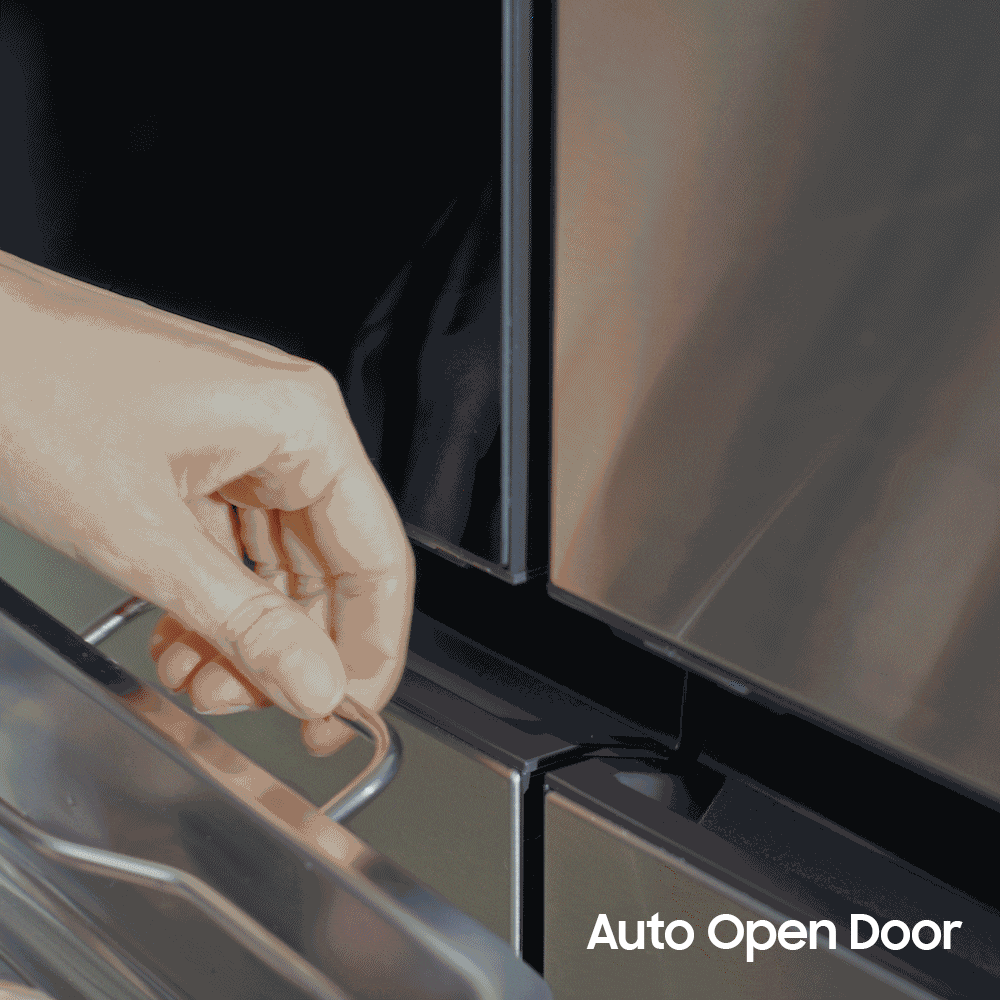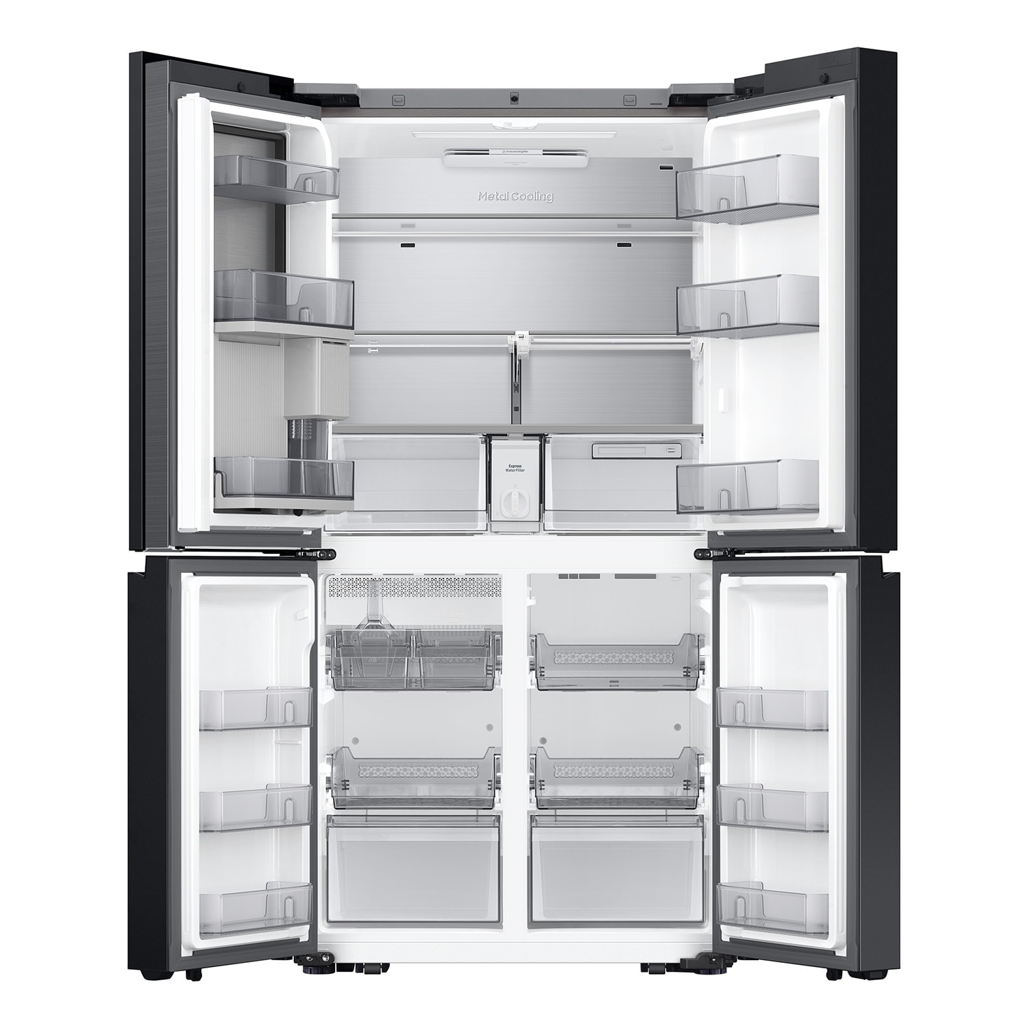 Samsung’s Bespoke 4-Door Flex™ Counter Depth 23 cu-ft Refrigerator features AI Family Hub™+ with the industry’s largest screen (Refrigerator smart video screen) and changeable door panels; (Changeable door panels are sold separately) AI Vision Inside(As of March 2024, AI Vision Inside can recognize 33 food items like fresh fruits and veggies; Recognizable food items will be regularly added and updated; If the food is covered by hand and not recognizable, it may be listed as an unknown item, but the user can always revise the item title through the Family Hub™ or SmartThings) automatically recognizes what’s in your fridge, so you always know what’s inside; Beverage Center™ provides quick and easy access to refreshingly cold water two ways; Open the refrigerator with ease, even if your hands are full with Auto Open Door; With just a light touch of the door sensor, the refrigerator door will open (An automatic closing function is not available; the actual open angle of the doors can be different by the installation circumstances and usage conditions like storing heavy items in the door bins; touch sensors can be turned on/off from the control panel/display, and its default setting is off).