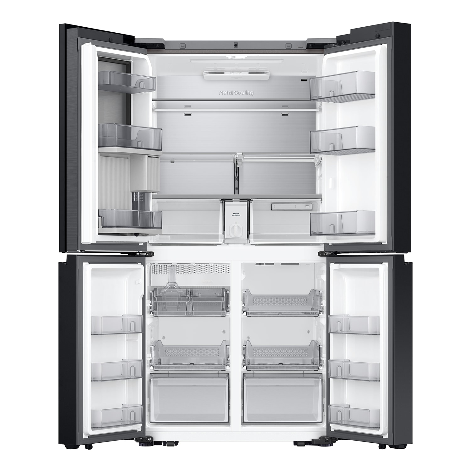 Samsung’s Bespoke 4-Door Flex 29 cu-ft Refrigerator features AI Family Hub+ with the industry’s largest screen (Refrigerator smart video screen) and changeable door panels; (Changeable door panels are sold separately) AI Vision Inside (As of March 2024, AI Vision Inside can recognize 33 food items like fresh fruits and veggies; Recognizable food items will be regularly added and updated; If the food is covered by hand and not recognizable, it may be listed as an unknown item, but the user can always revise the item title through the Family Hub or SmartThings) automatically recognizes what’s in your fridge, so you always know what’s inside; Beverage Center provides quick and easy access to refreshingly cold water two ways; Open the refrigerator with ease, even if your hands are full with Auto Open Door; With just a light touch of the door sensor, the refrigerator door will open (An automatic closing function is not available; the actual open angle of the doors can be different by the installation circumstances and usage conditions like storing heavy items in the door bins; touch sensors can be turned on/off from the control panel/display, and its default setting is off).