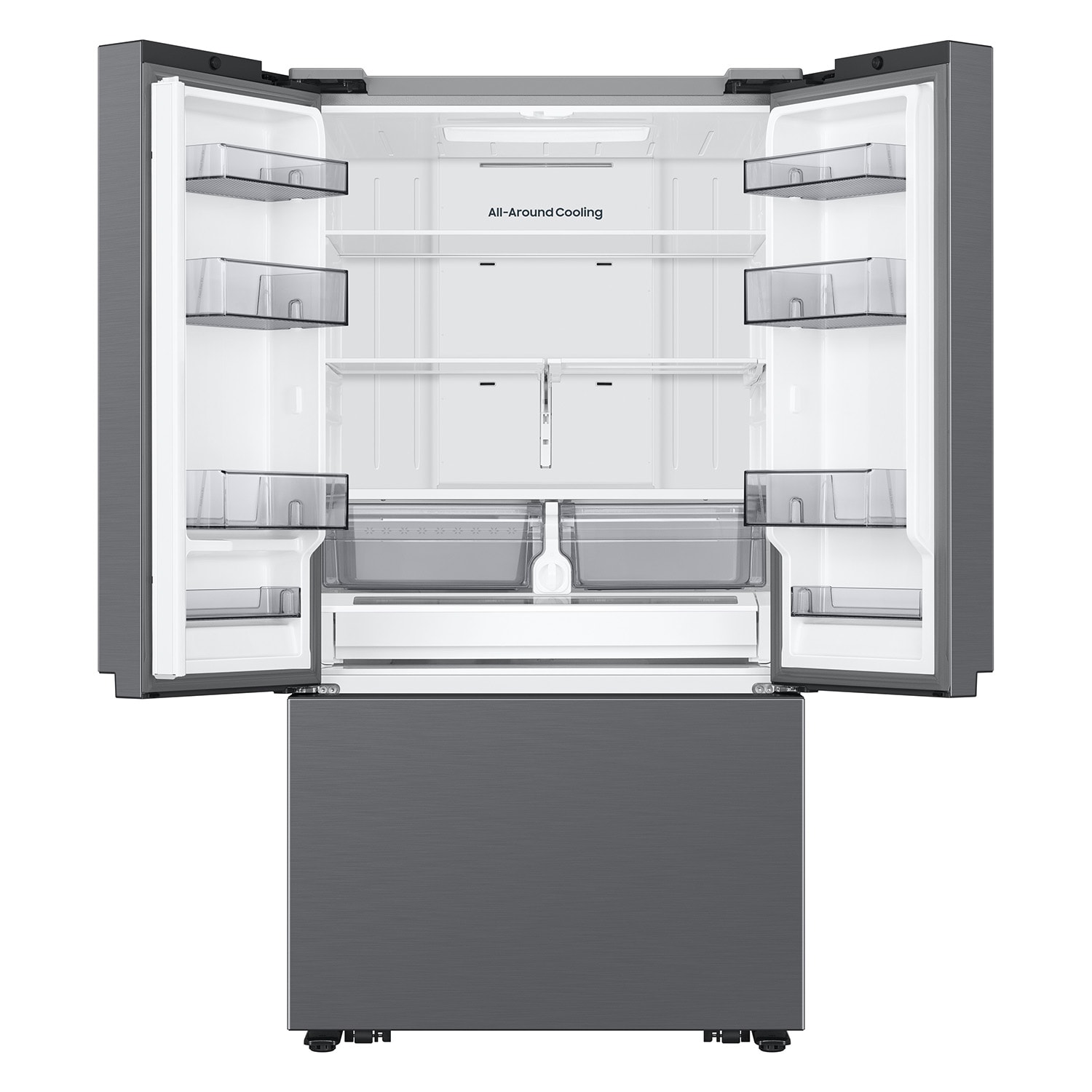 Samsung Mega Capacity 3-Door French Door Counter Depth refrigerator features 27 cu. ft. capacity, Dual Auto Ice Maker and a modern design with a Stainless look finish.